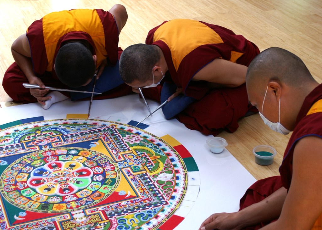 The word mandala comes from Sanskrit and means circle, although most mandalas are a combination of circular and square geometries, representing the universe, order and wholeness. Mandalas can be both artistic and ritualistic and as I mentioned can exist in forms other than paintings.