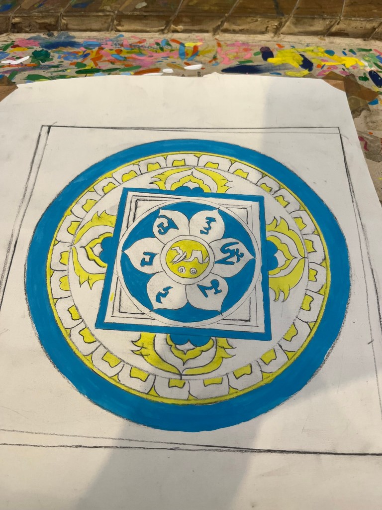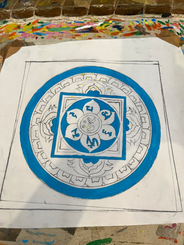My teacher had already drawn out the pattern for me and explained that I would do the painting sitting on the floor with my legs folded. This is intentional as the process of painting is supposed to be a type of meditation. Each color has a different meaning within the painting; blue for infinity, green for harmony, orange for compassion and so on. I sat on the floor for about 30 minutes before my feet started to go numb and then I shifted to a small stall. However, I remained focussed and painted for around 2 and half hours with full concentration and not taking a break. It did actually feel quite meditative as you have to focus so closely on painting within the boundaries for each color that you don’t have much opportunity to think about any thing else.