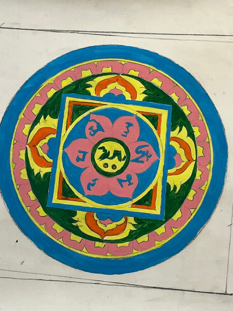 My second craft activity during my time in Kathmandu was to try my hand at painting a mandala. Mandalas are a Tibetan Buddhist tradition that serve as meditation aids, visualising divine palaces where deities reside. Since our time in Lhasa, travelling across Tibet and now in Kathmandu we had seen hundreds of shops showcasing this artistic style, but I had yet to really go into a shop, look at the art closely and understand what they were. We had also seen three-dimensional mandalas in Jokhang Temple and Potala Palace in Lhasa, and a sand mandala in Sakya monastery.