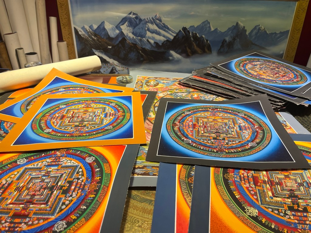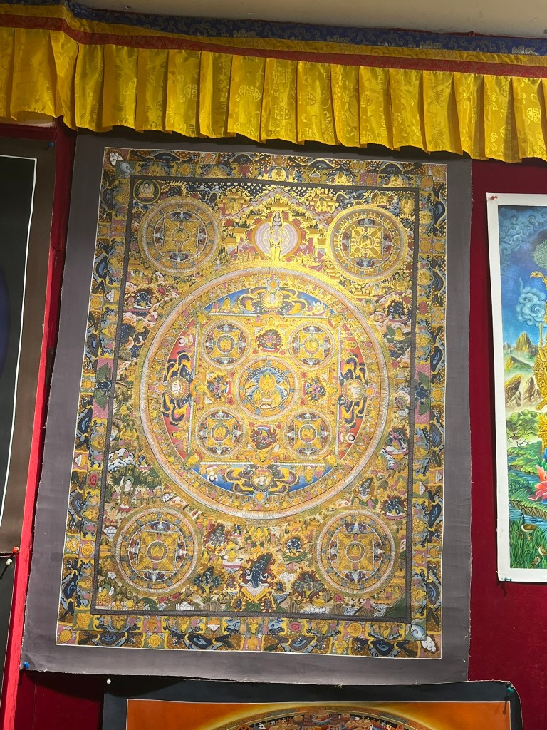 Once I had finished we went upstairs to the teacher’s studio where he showed me some professionally painted mandalas and explained to me the meaning behind them, which ones were designed by the Dalai Lama himself, as well as how to recognise a mandala painted using natural pigments versus one made with manufactured pigments. The price difference was quite significant as well! He showed me a series of thangka paintings that had been done by a monk, who during the winter comes from his monastery near Everest to stay with the teacher and paint. I thought this was quite a nice story, so decided to invest in one of the monks pieces.