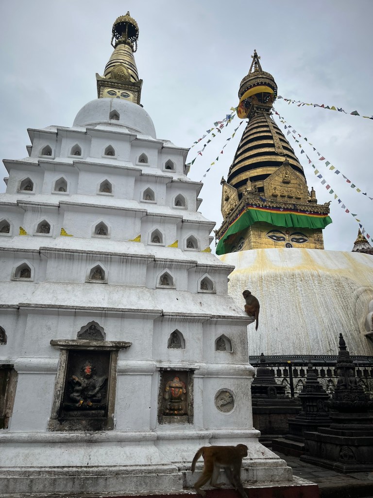 It is known as the Monkey Temple….because there are a lot of monkeys in the complex. They are literally climbing over everything and likely attracted by the offerings left by pilgrims. You need to climb up about 50 steps from the car park to reach the main area and from here you also get a great view of Kathmandu Valley. You need about 30-45 minutes here max to enjoy looking around.