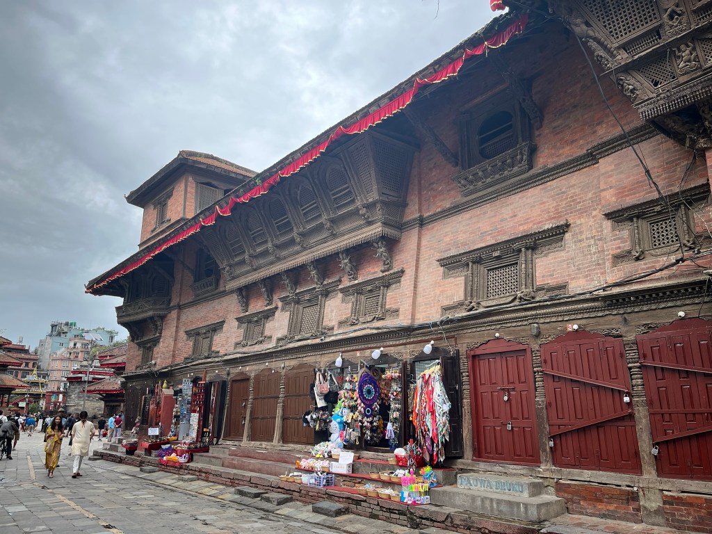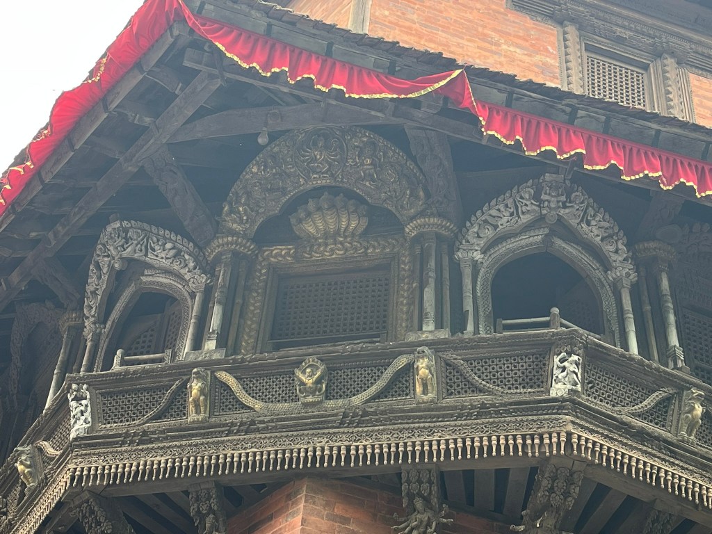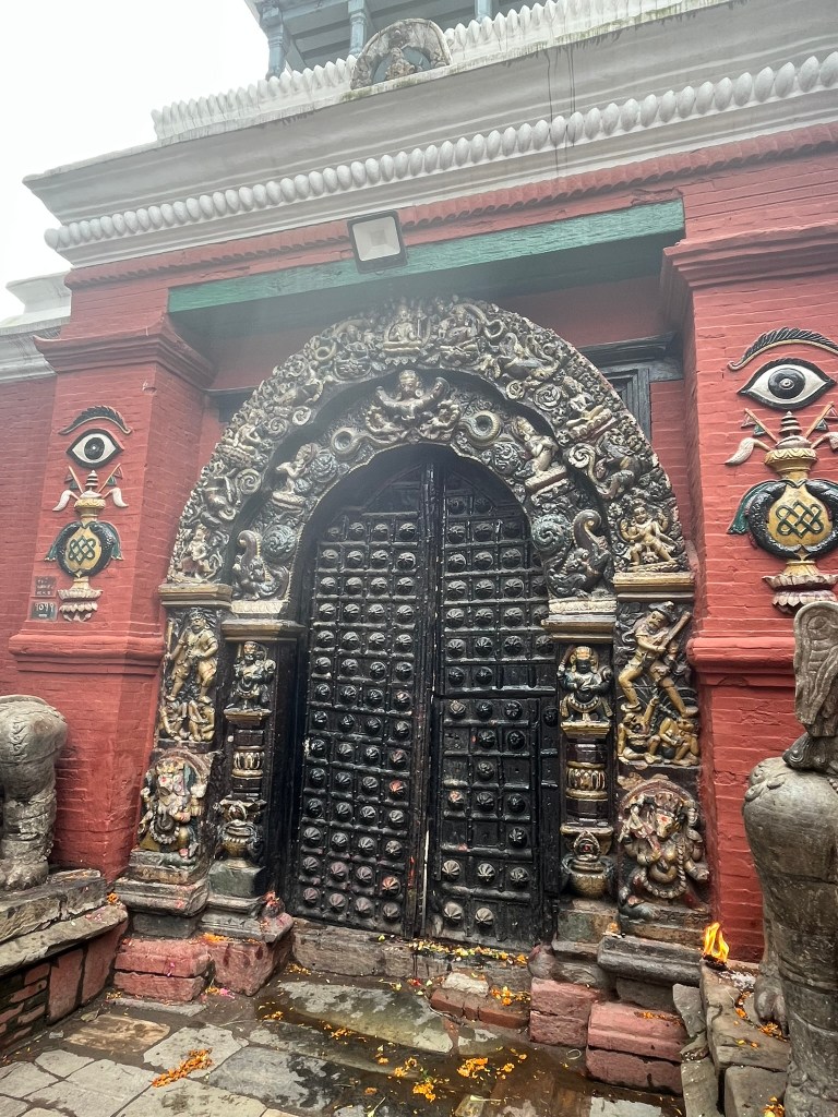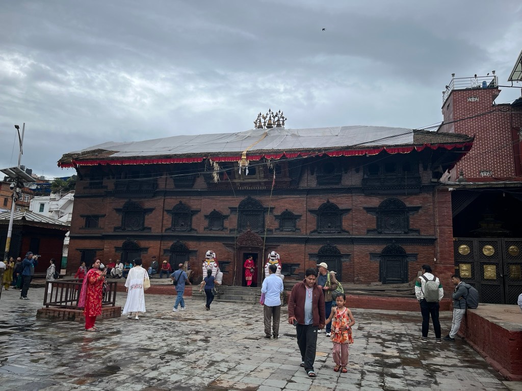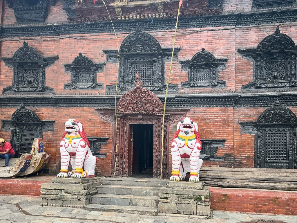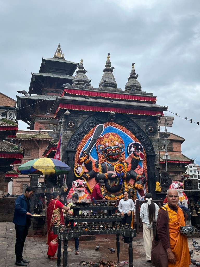 There is also a very curious smaller palace within the complex that houses ‘the living goddess’ or Kumari. This is a tradition in Nepal where a young girl is selected from the Newar community to be revered as an incarnate goddess and a form of Durga (the goddess that is being celebrated during Dashain). Most interestingly, a new Kumari had only been selected 2 days before hand, a young girl of just 2 and a half years old. The selection process is rigorous with physical and spiritual criteria. She would now live inside her palace, giving blessings and only coming out into public for specific ceremonies and festivals in her chariot. She would stay until she hit puberty at which time a new Kumari would be selected and the previous would go back to her regular life. Our guide explained, during her time in the palace, she would receive education, and have the opportunity to play with other children but that she would receive pilgrims for at least 2-3 hours a day which seems kind of crazy. As we visited the courtyard of the palace there was a growing line of locals to meet the new Kumari, but foreigners are not allowed.