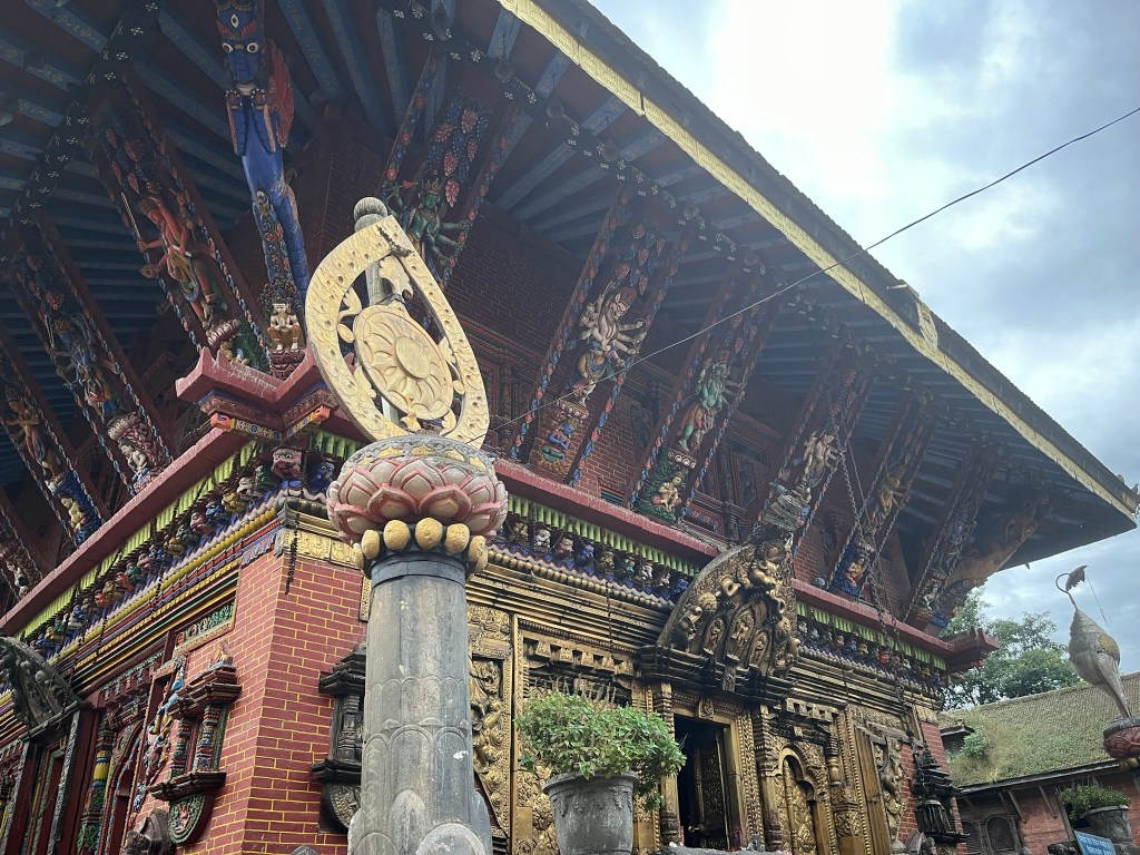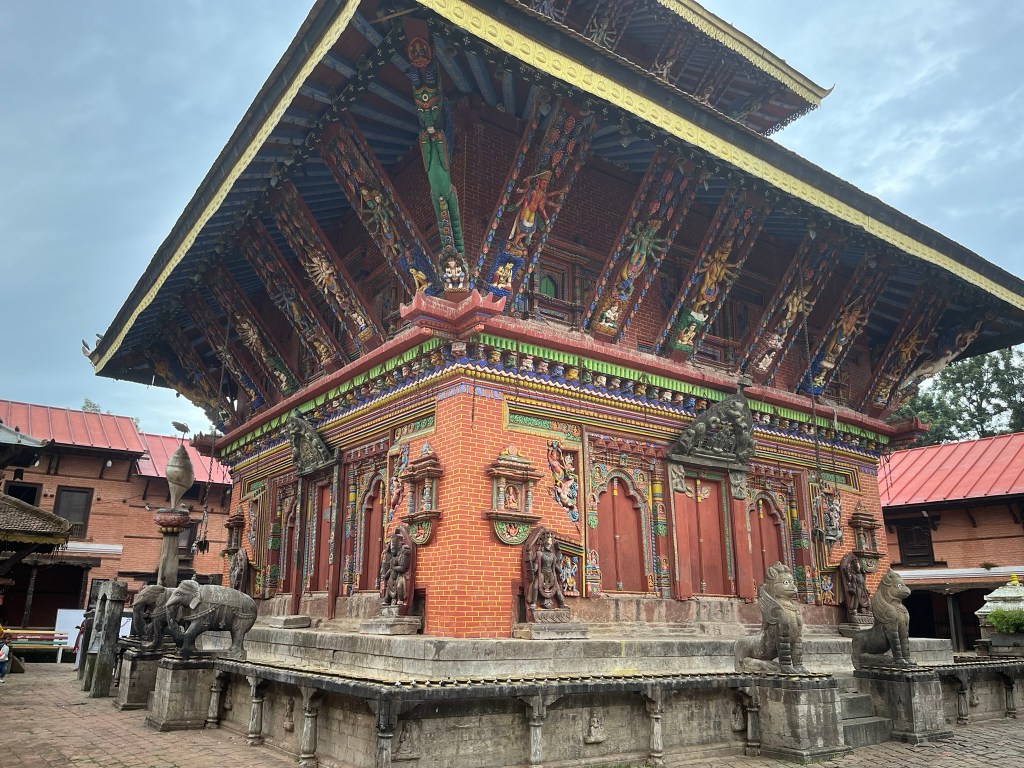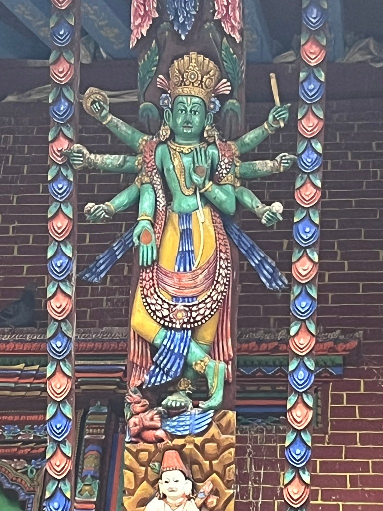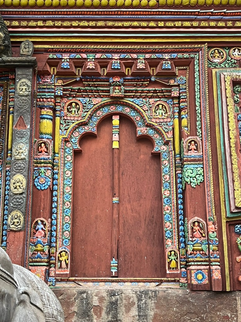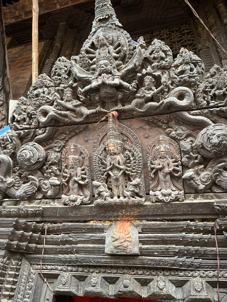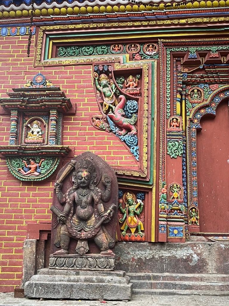 What I found particularly special about the temple is that it has recently be painted using natural pigments. None of the temples or pagodas we have seen so far have retained their ancient painting and it is very expensive to repaint using the natural pigments that would have been used centuries ago. So to see what all the temples and pagodas would have looked like in Kathmandu and Bhaktapur Durbar Square gave you a better sense of just how spectacular these palaces must have been.