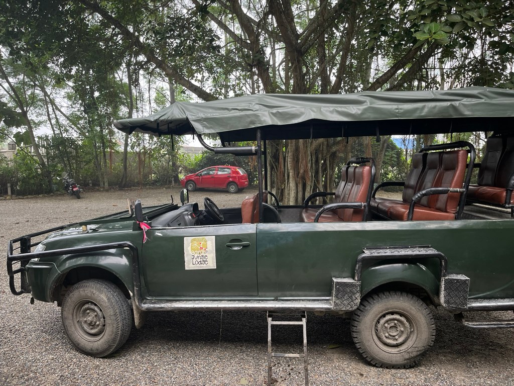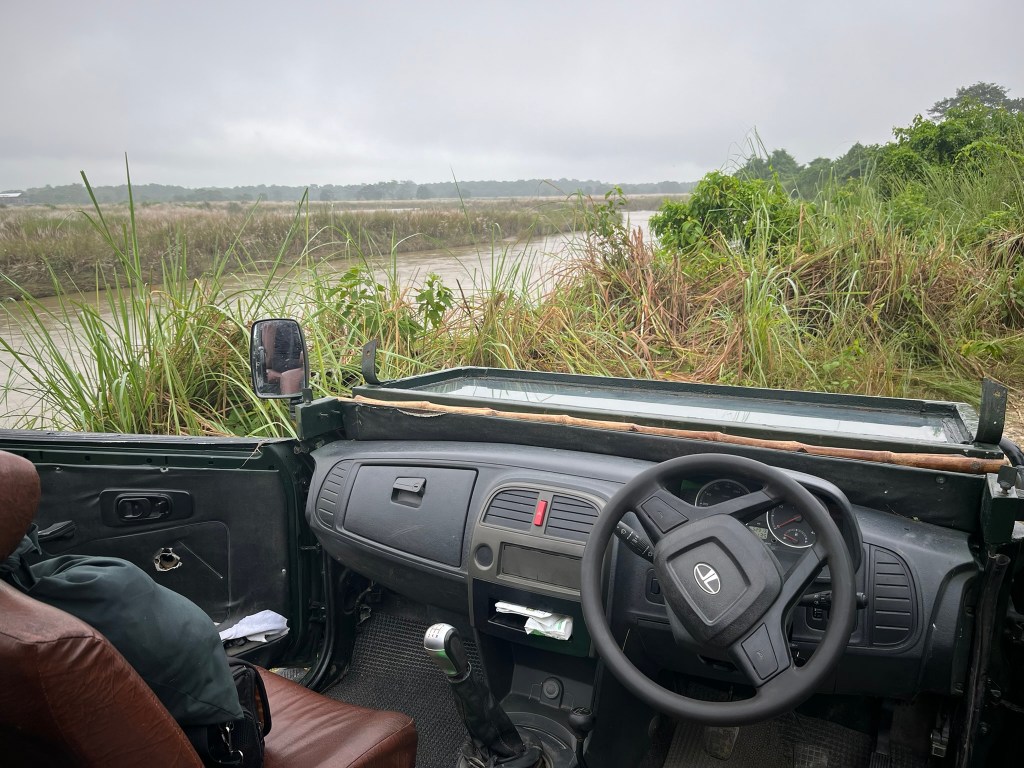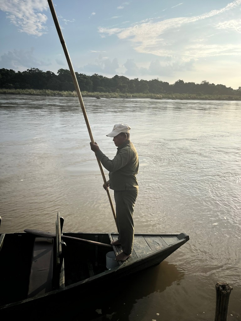 Our nature guide for our stay, Tek, planned for us to do a morning jeep safari and afternoon river safari. Our vehicle was on the other side of the river, and because the river was running so high we had to have a mini adventure just to get our safari started. We drove upriver to another resort and jumped in a small boat, powered only by 2 men with long sticks who had to carefully maneuver the boat along the fast flowing river to the other side, and then literally get out of the boat and pull us up a smaller and more quiet branch of the river until we reached a spot where we could safely disembark. We then clambered up the side of a steep muddy bank and finally we were ready to set off. The benefit of this short little adventure was that we landed right in the heart of the park, avoiding a 3 hour drive just to get to the same spot.