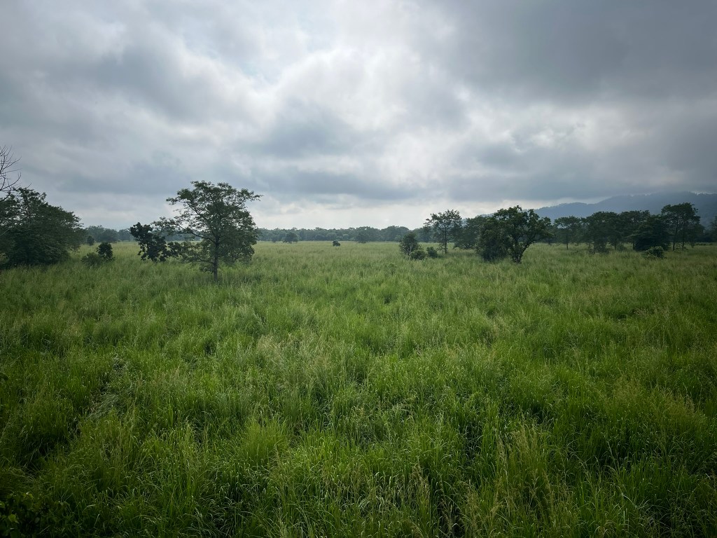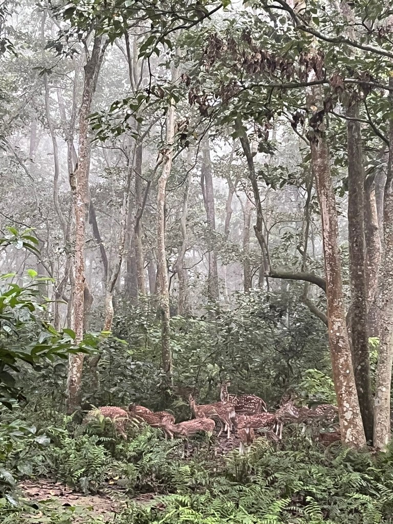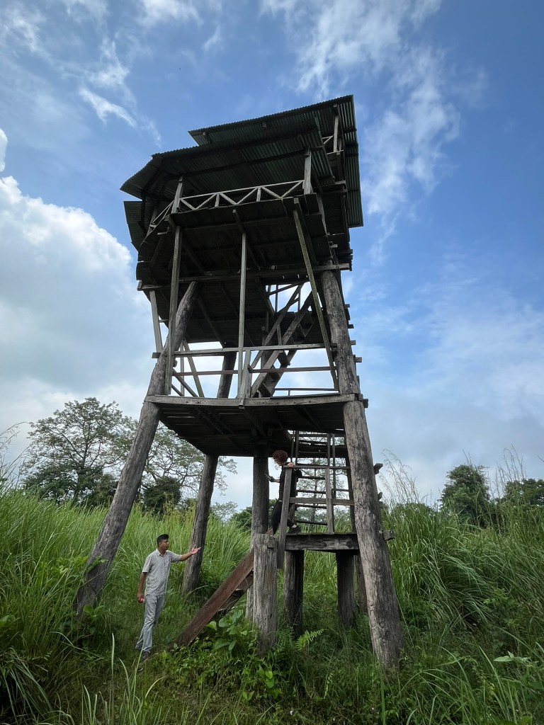 We explored the park for about 4 hours on our morning safari, travelling through wetlands, marshy areas and grassland. These all have very dense vegetation, even the grassland is full of 10 feet tall elephant grass, meaning you have to keep a keen eye out for any wild life. We saw lots of groups of spotted deer travelling through the foliage and tons of different bird species. And we knew there were tigers in the area as we found a number of fresh footprints in the mud. At around 10am we stopped for coffee on top of a watch tower and got a birds eye view of the habitat. And then finally at around 11am we stumbled upon a mother rhino with her baby munching on food by one of the swampy ponds. We got to watch and enjoy for about 20 minutes before we had to start heading back to the lodge. It was a brilliant first sighting of such an incredible animal.