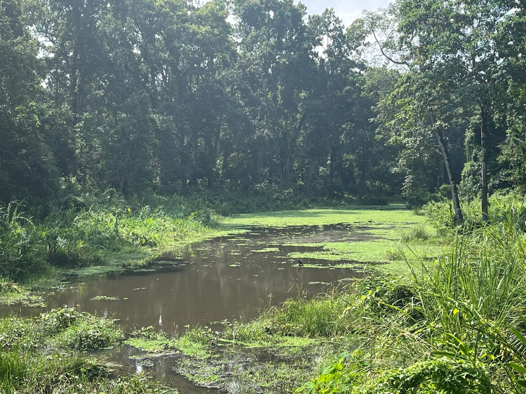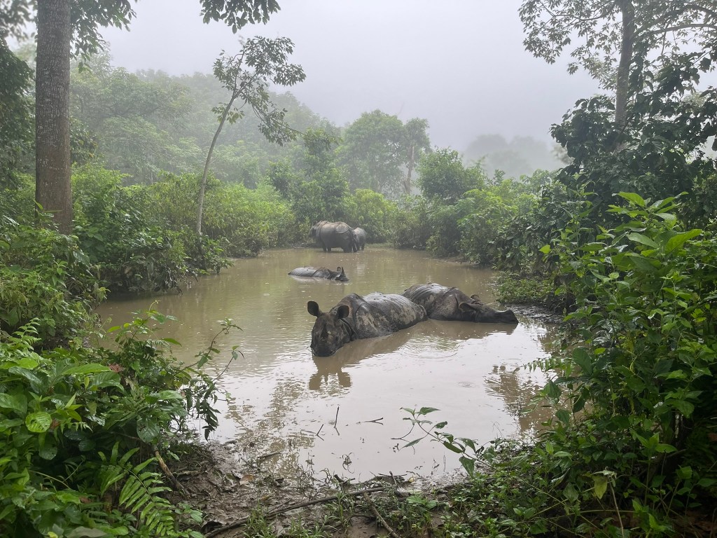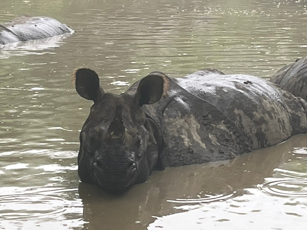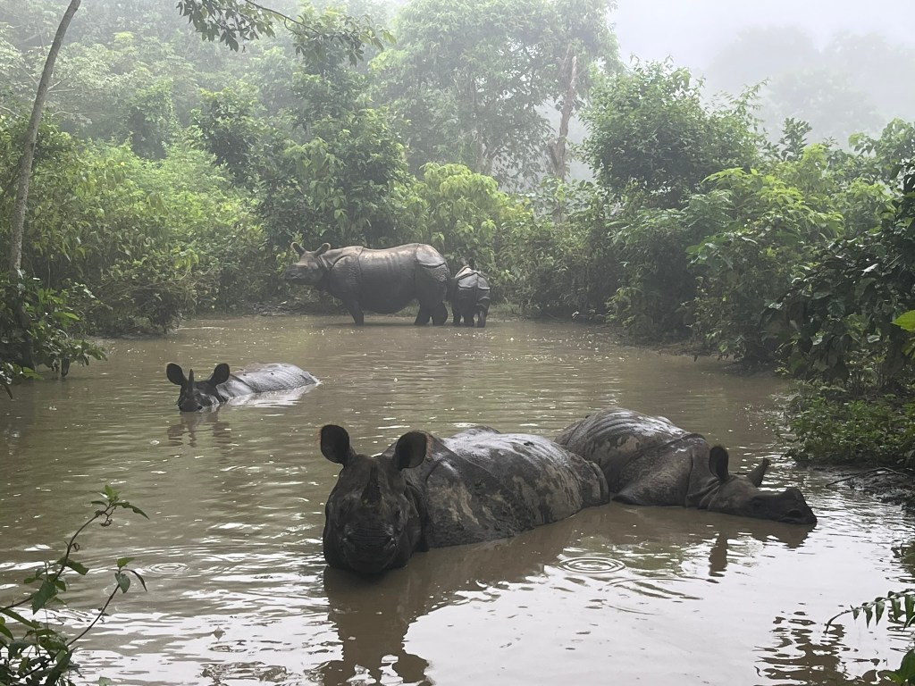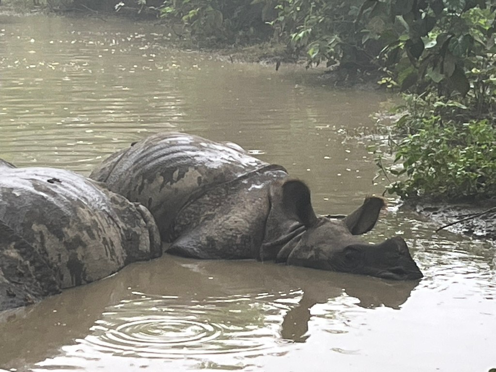 The lodge was very generous and offered us an additional morning safari before we had to return to Kathmandu, which of course we jumped at the chance to do. We set off very early the next morning, to a different part of the park, this time without having the excitement of crossing the river. And this time we were super lucky and quickly found 5 rhinos wallowing in a pool together. We were so close, just maybe 2 meters from the closest rhino in the water and we were able to watch them for about 20 minutes. There were 3 rhinos fully submerged in the water and then a mother and her baby standing up in the back. I’m so glad we were able to go out again for another chance to see them.