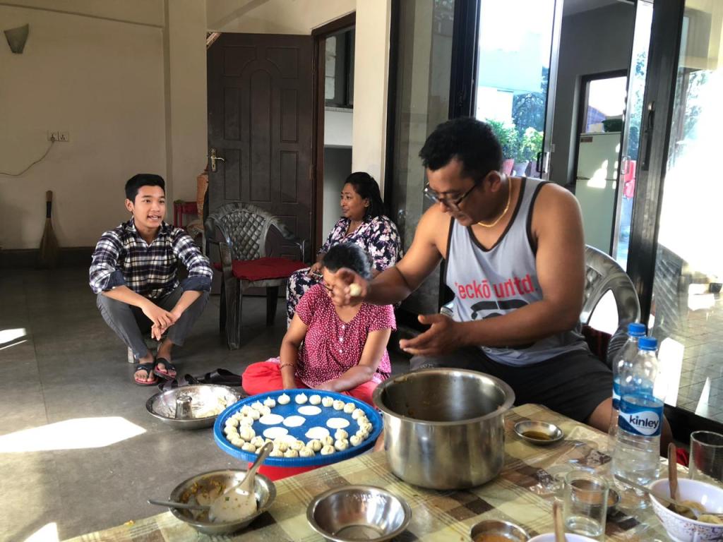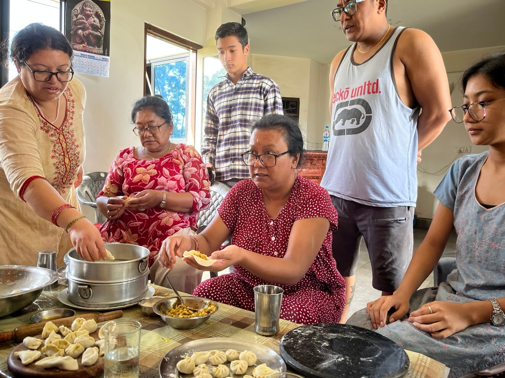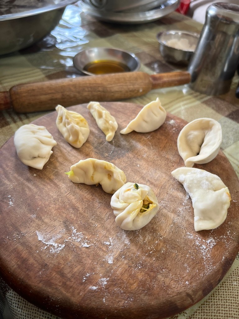 We started off by mixing a variety of spices with the vegetable filling. Each family will have their own recipe and adjust the spices to their taste. The mixture then got lightly fried off to reduce some of the water content. We made the wheat dough, which was just a simple mix of wheat flour and water. And then it was time to start filling. We tried all the different types of designs for sealing the momos and everyone had a good laugh at the badly shaped ones we were making. I made a couple, thinking we would in total make maybe 50 momos, but the family kept going and was still making them even after we had eaten our lunch and were ready to depart. They said they planned to make over 300 momos and have a big family dinner later that day.