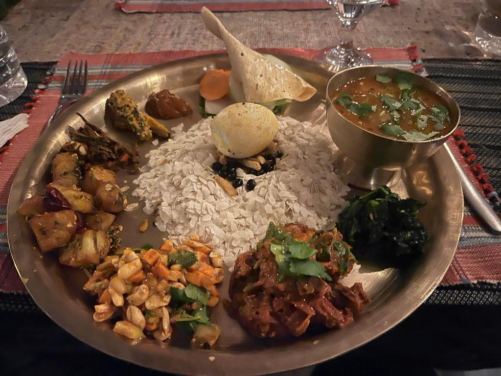 I got to try a huge range of food during my time in Nepal and was keen to try things I had never had before. On our last night in Bhaktapur, our guide suggested I try a ‘Khaja set’ at the restaurant we were eating in, which is like a festival version of dal bhat. In this, I got to try chiura baji which is rice that has been beaten and then forms flakes. It is chewier and drier than regular rice but actually very nice, especially after soaking it in dal. The set also included choila, which is marinated meat with mustard oil, fenugreek and coriander. And bhatmas sadeko, a marinated salad of peanuts and corn. It was all great, and I’m glad I gave it a try.