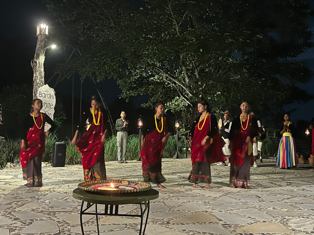 The Tharu and Kumal people are two of the oldest and most distinctive ethnic groups in Nepal’s lowland region bordering India, known as the Terai region. Both groups have deep connections to the land and forest ecology of the plains and their lifestyles reflect an adaptation to the hot, malaria-prone environment that once kept outsiders away. Each night a dance troupe from either the Tharu or Kumal community visit the Bahari Jungle Lodge in Chitwan to showcase their traditional dances, songs and attire.
