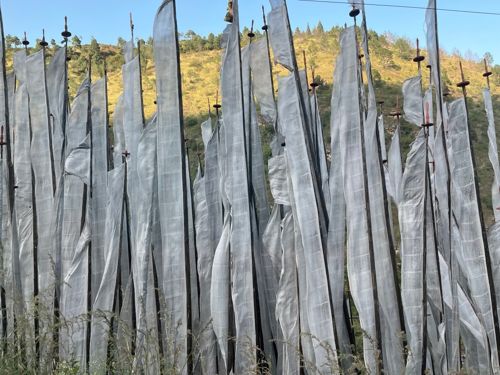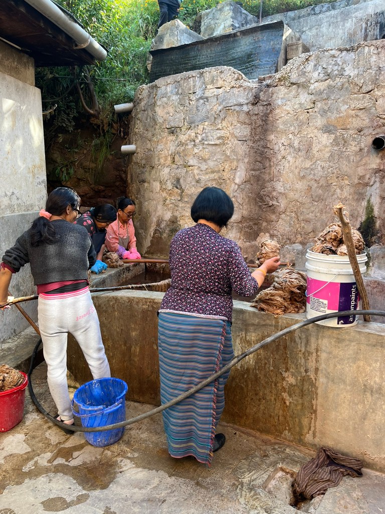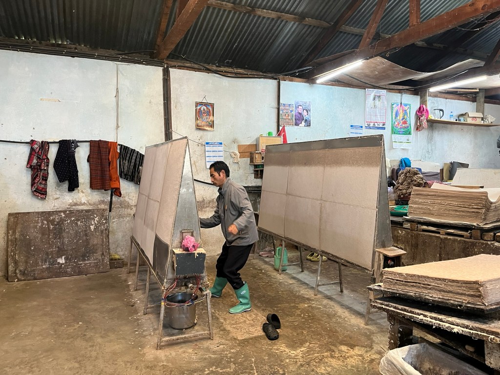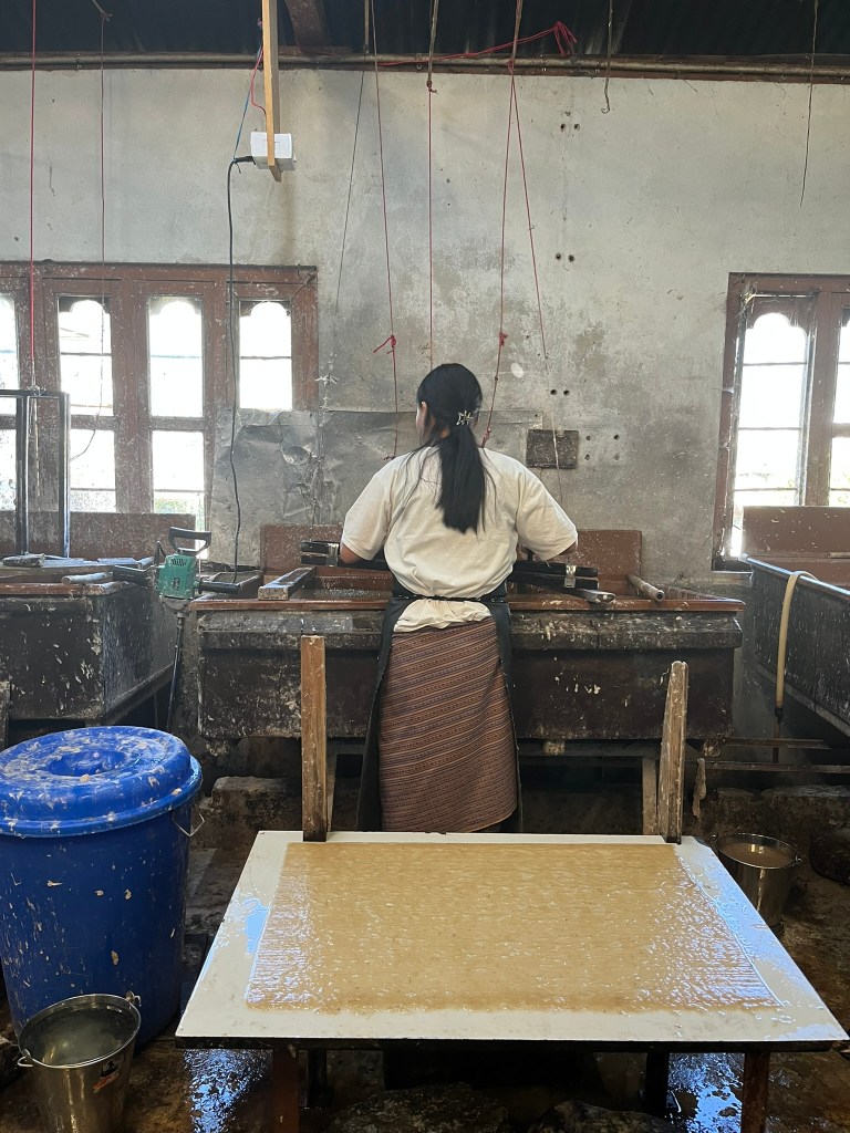 As we departed Thimphu we briefly stopped in at a paper factory on the outskirts of the city. Jungshi Handmade Paper Factory is a small workshop where you can see the traditional craft of making paper from the bark of the Daphne tree. This is officially one of Bhutan’s thirteen traditional arts. Handmade paper, known as Dehsho has been produced in Bhutan for over 1000 years. It was originally a monastic craft, used for Buddhist scriptures and prayer books. Traditionally monasteries would have made their own paper using local plant fibers. The aim of this factory is to revive and sustain this tradition, whilst also providing rural employment and producing eco-friendly paper. Later in the day, in the village we visited, I bought 2 paintings of dancers performing in the masked dance festival that were painted on this handmade paper.