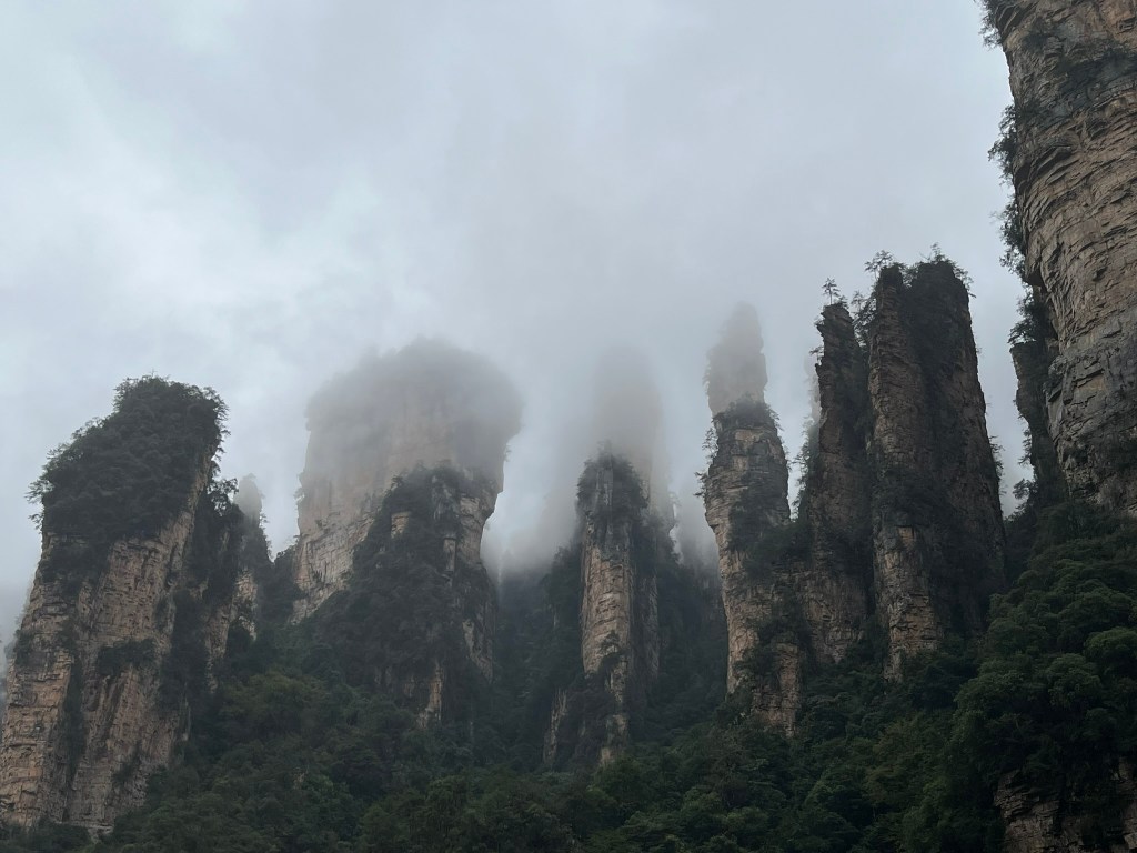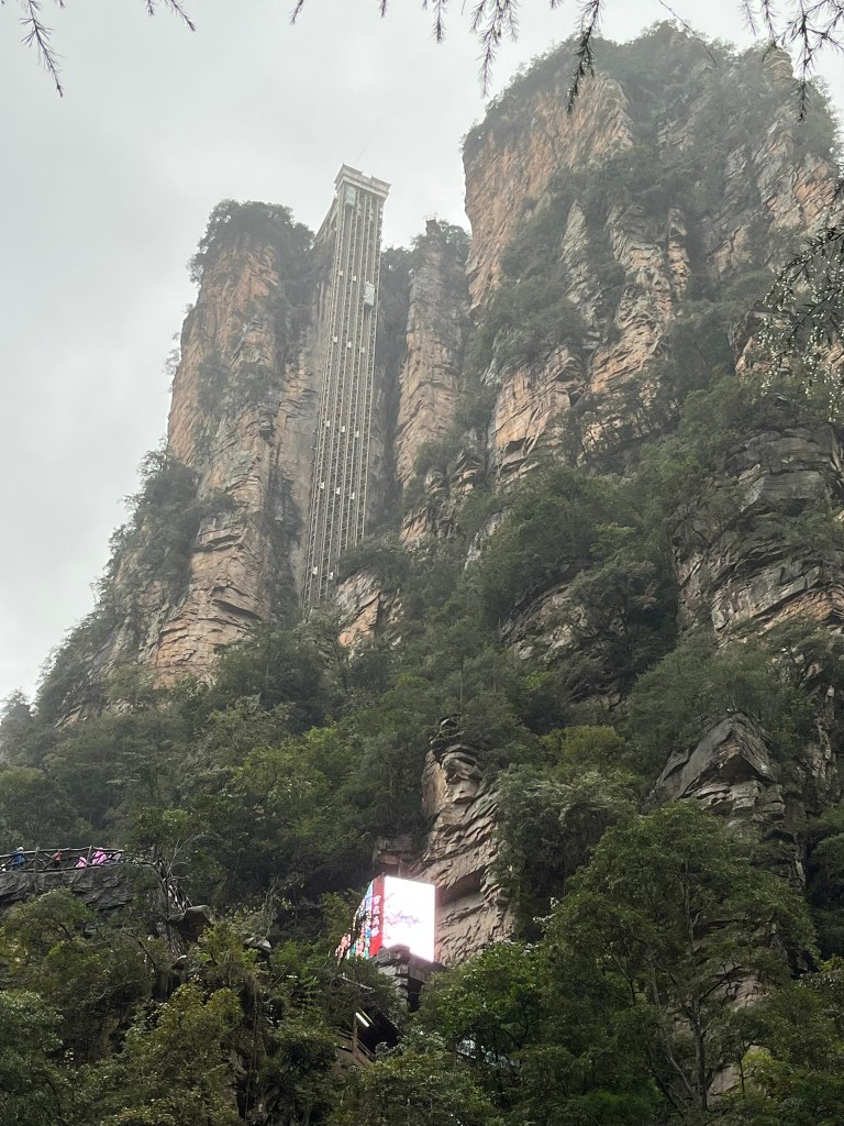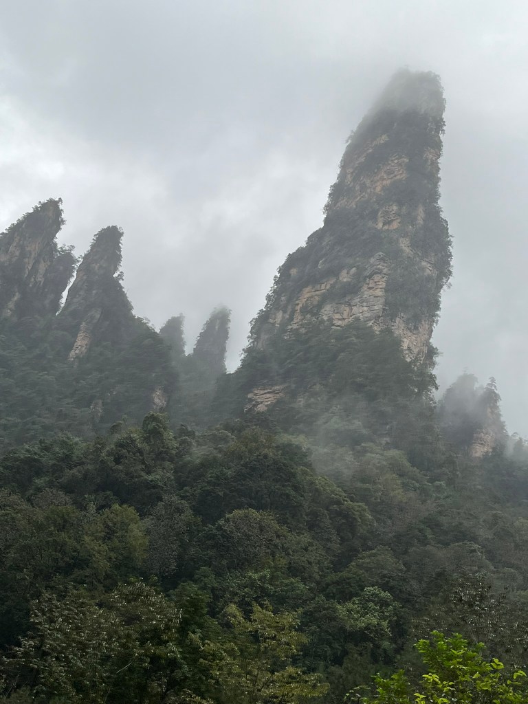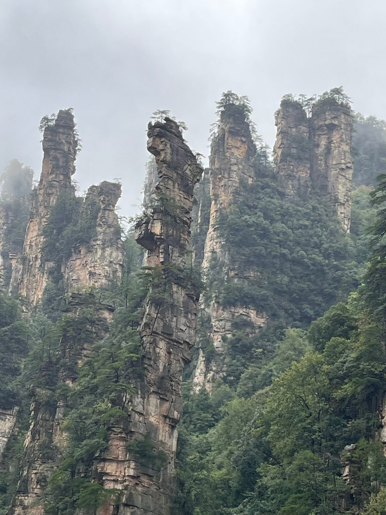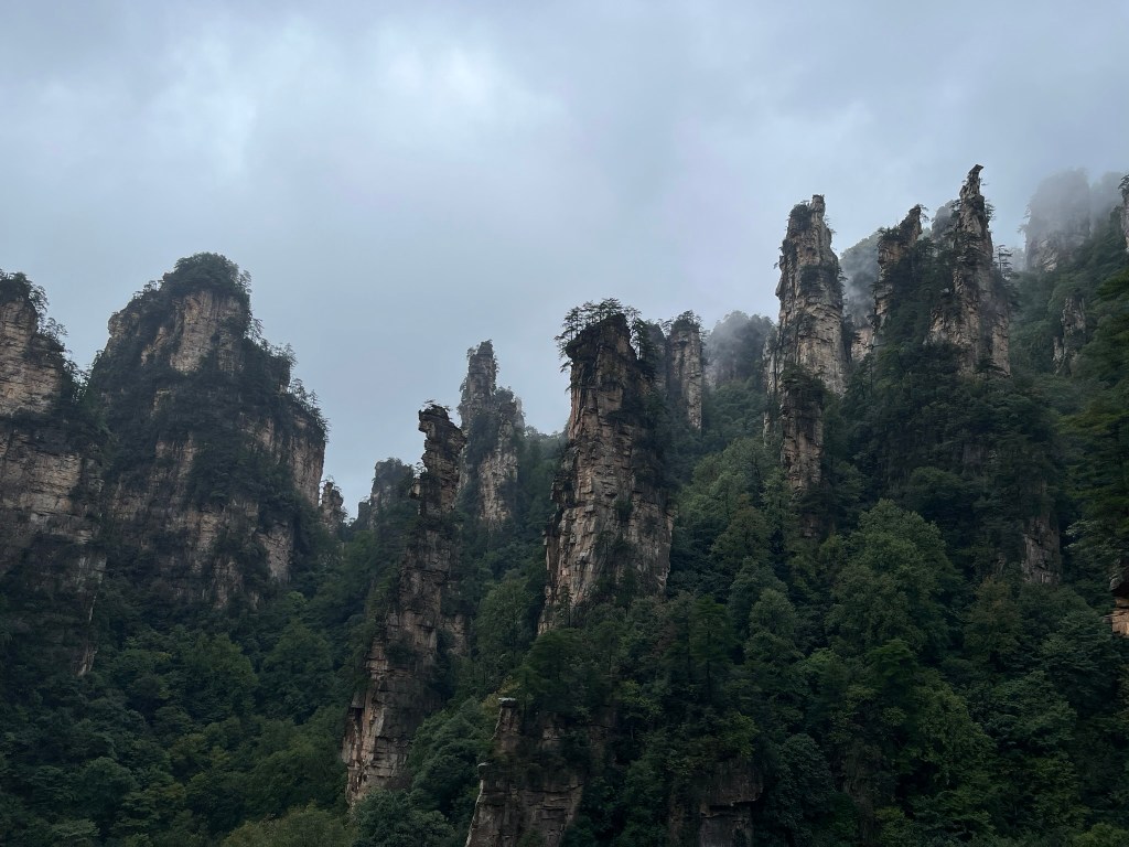 We jumped onto another shuttle bus which takes you to the Bailong Elevator. This is a glass lift built into the cliff face and said to be the world’s highest outdoor elevator. The queues were getting quite long and to save time I opted to buy the ‘VIP’ lift pass which basically lets you skip the queue and was totally worth it as we had a busy day of sightseeing planned. It was only at the top of the cliffs, after the 90 second ride to the top that I realised just how bad the weather was. At times there was zero visibility. However, as the wind blew the mist away in swathes, we did get glimpses of the sea of stone towers we were surrounded by. It really is a magical place and I can imagine it is absolutely breathtaking on a clear day. I did however like how mystical the mist and clouds made it feel.