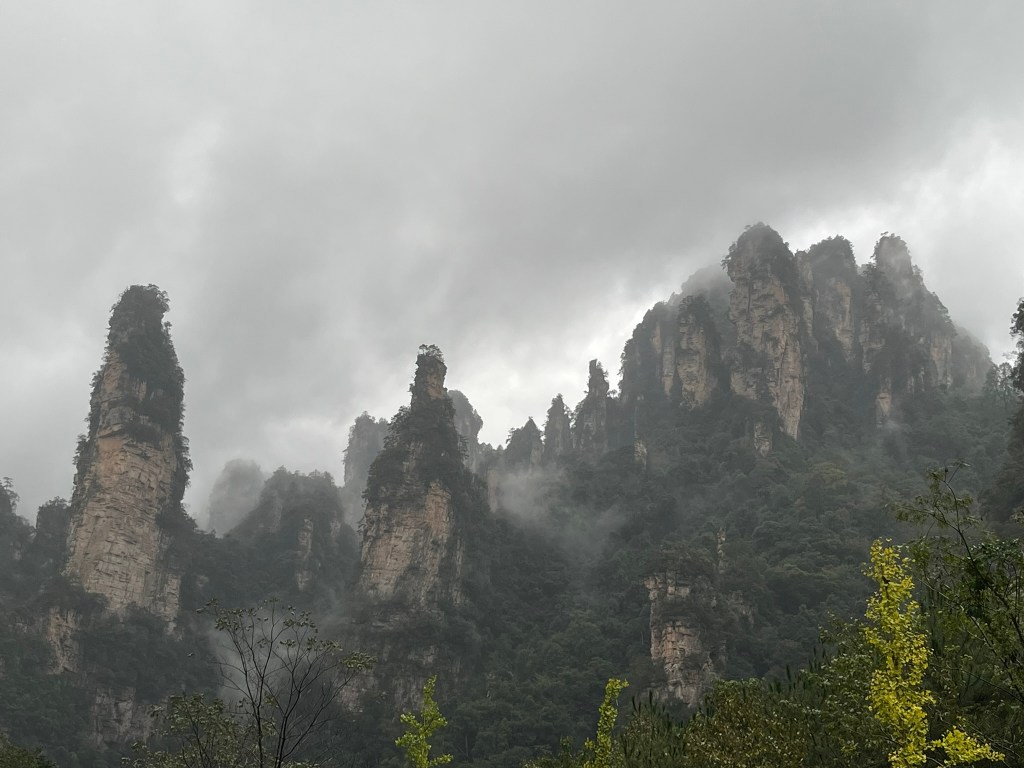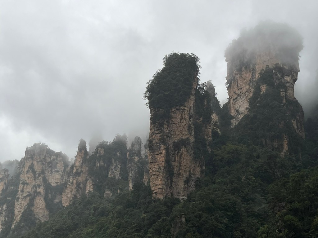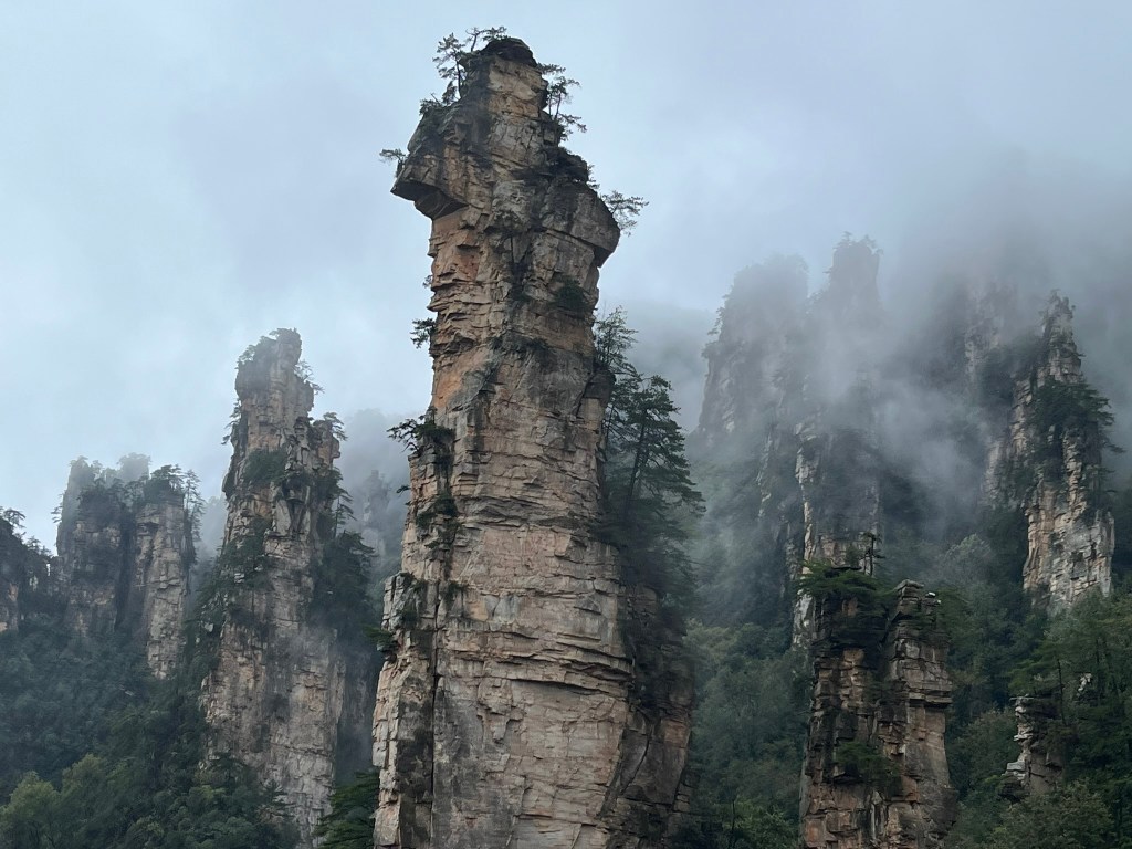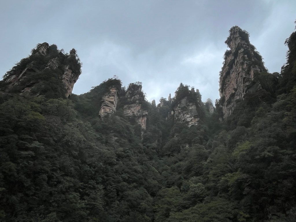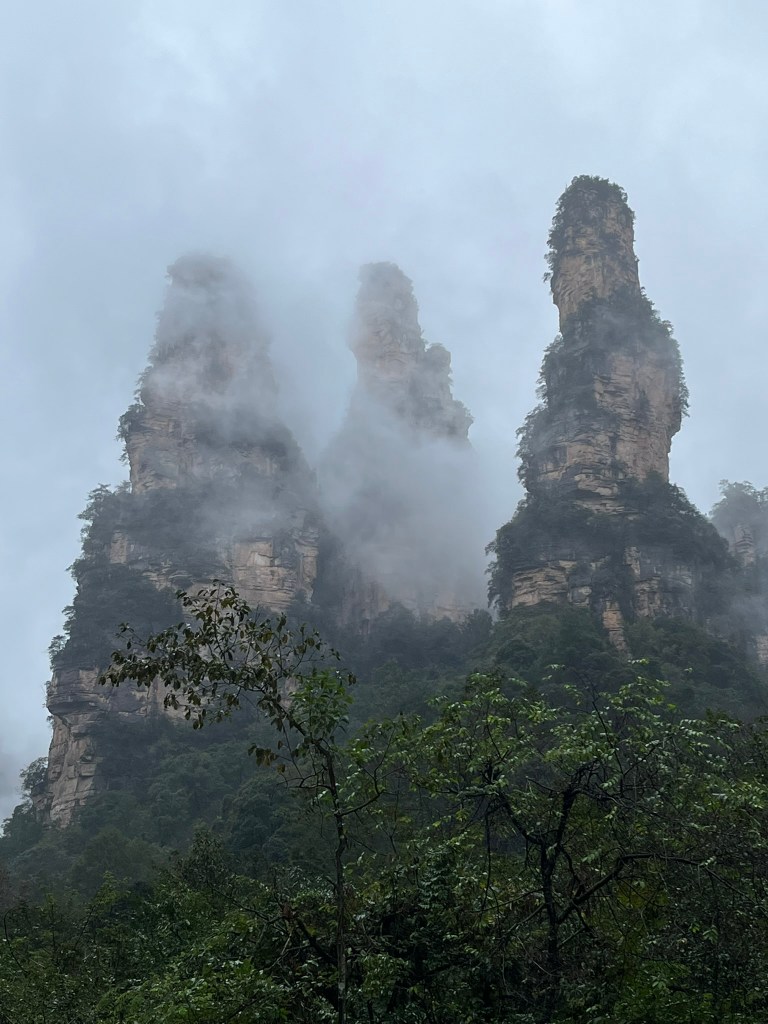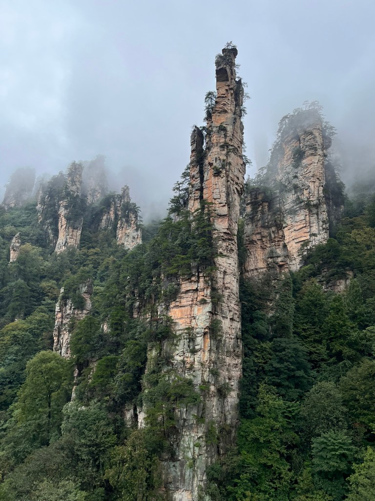 We jumped onto another shuttle bus which takes you to the Bailong Elevator. This is a glass lift built into the cliff face and said to be the world’s highest outdoor elevator. The queues were getting quite long and to save time I opted to buy the ‘VIP’ lift pass which basically lets you skip the queue and was totally worth it as we had a busy day of sightseeing planned. It was only at the top of the cliffs, after the 90 second ride to the top that I realised just how bad the weather was. At times there was zero visibility. However, as the wind blew the mist away in swathes, we did get glimpses of the sea of stone towers we were surrounded by. It really is a magical place and I can imagine it is absolutely breathtaking on a clear day. I did however like how mystical the mist and clouds made it feel.