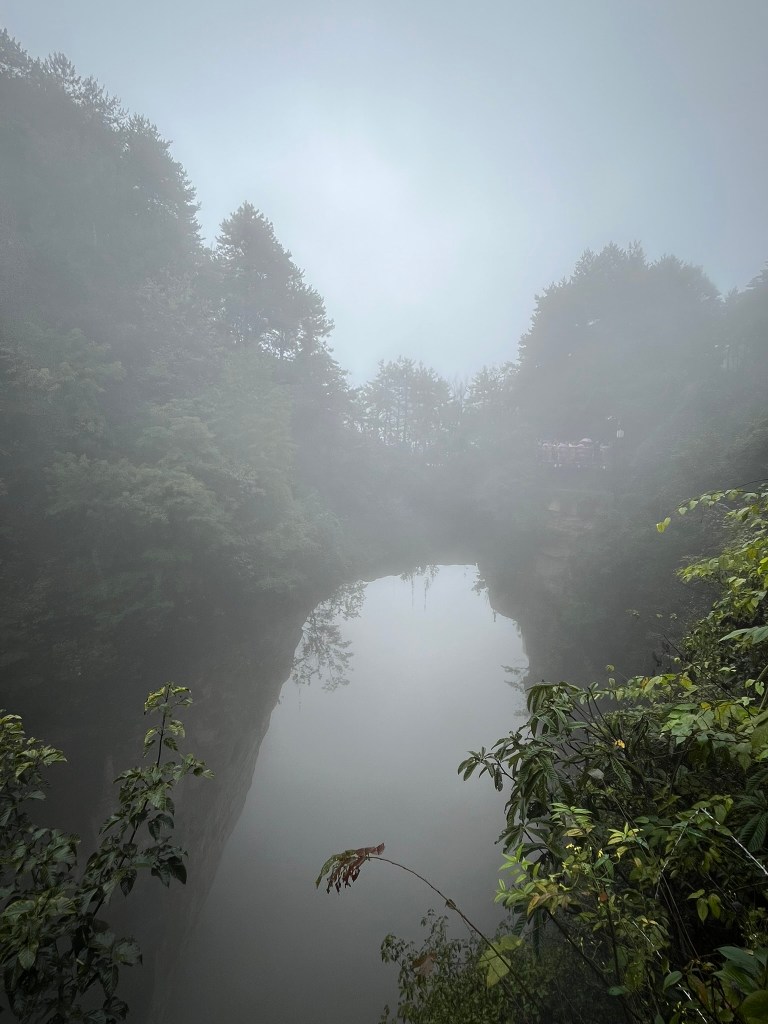 The walk from the elevator to the next shuttle stop is supposed to be one of the park’s most spectacular circuits and the loop of 3km takes about 2 hours at an easy pace. The Yuanjiajie Plateau is roughly 330m above the valley floor, and the circuit clings to the cliff edge, linking a series of look outs. It’s paved but the path does undulate and there are stairs in places. One of the highlights (that I could literally just make out the edge of through the clouds) is Hallelujah mountain. It stands along an isolated, and near the bottom of the pillar it narrows. With clouds surrounding it, it looks like it is floating. The other highlight (that thankfully I could actually see) is the First Bridge Under Heaven, a natural stone arc spanning 2 peaks, about 50m long and 5m wide.
