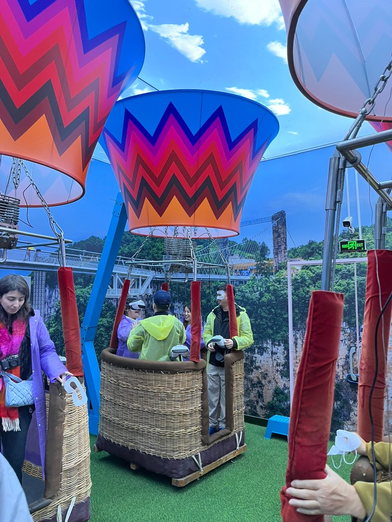 I am in China, so of course exploring the canyon would not be a simple nature walk along the rim, or hike down into the gorge. Instead you start by crossing a 400m glass floor bridge that spans the canyon and give you great scenic views. On the opposite side, you head to a room full of swinging mini hot-air balloons, that each hold 4 people, where you put on your virtual reality headset and experience flying through the sky over the canyon.