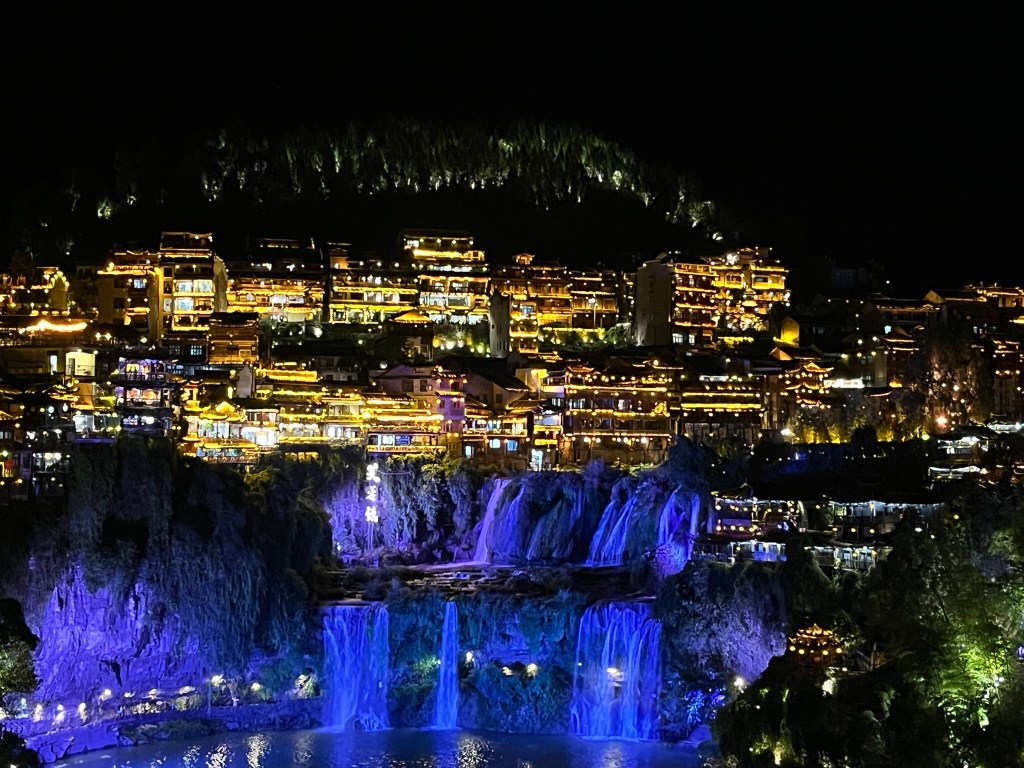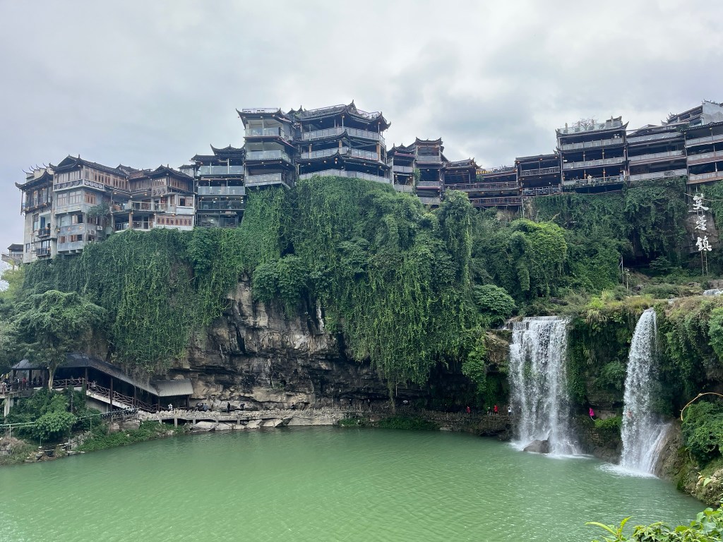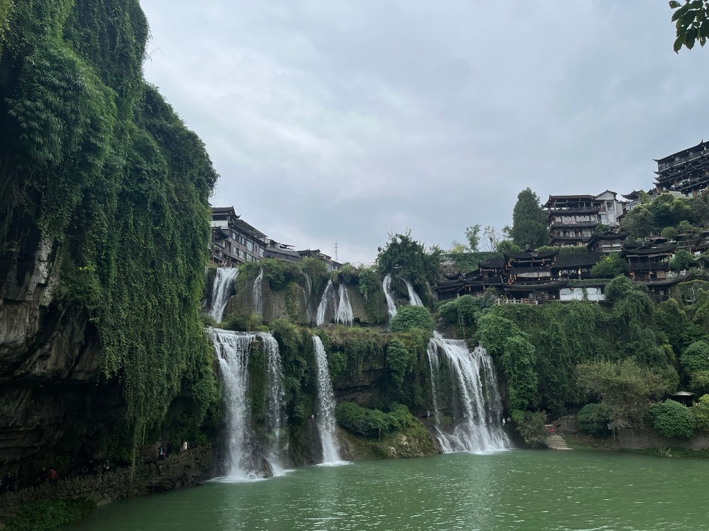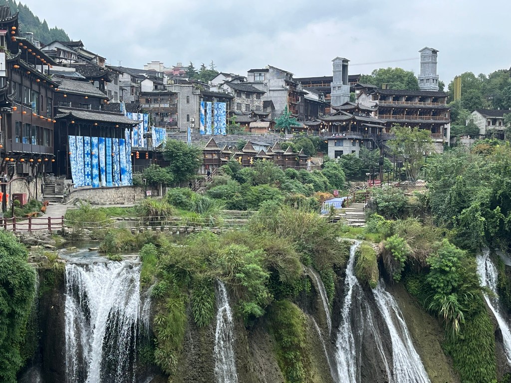 Today the town is like a living museum. You can walk around the Tujia King’s Palace, now a performance space on the upper terrace of the old town. The design of the palace blends Tujia tribal motifs with Han Chinese imperial symbolism, showing how the chieftains blended loyalty to the emperor with their own local authority. You can also climb down a steep set of steps to pass literally under the waterfall and then climb the steps on the other side of town to explore a maze of streets with tens of restaurants offering great views directly down onto the cascading waterfall.