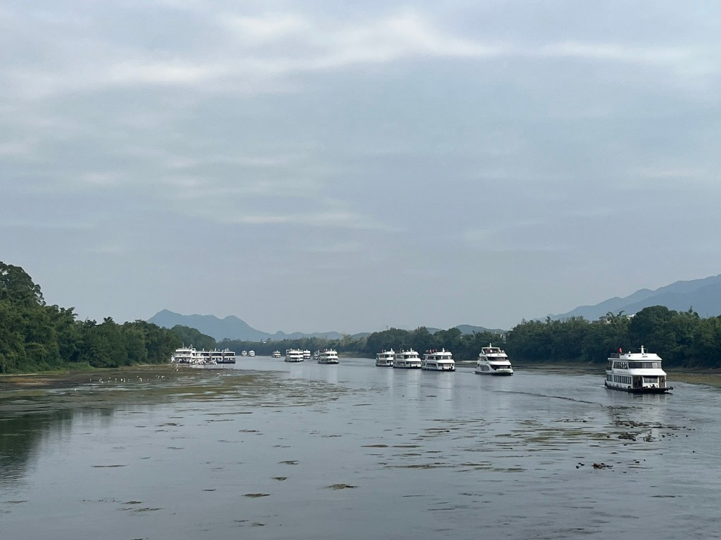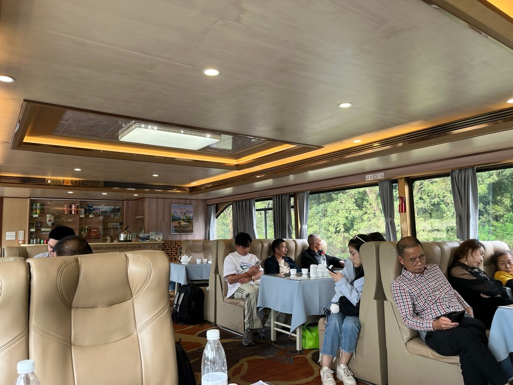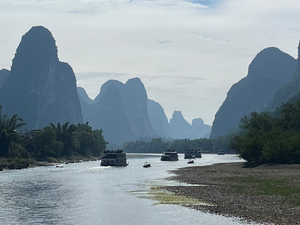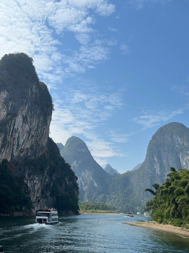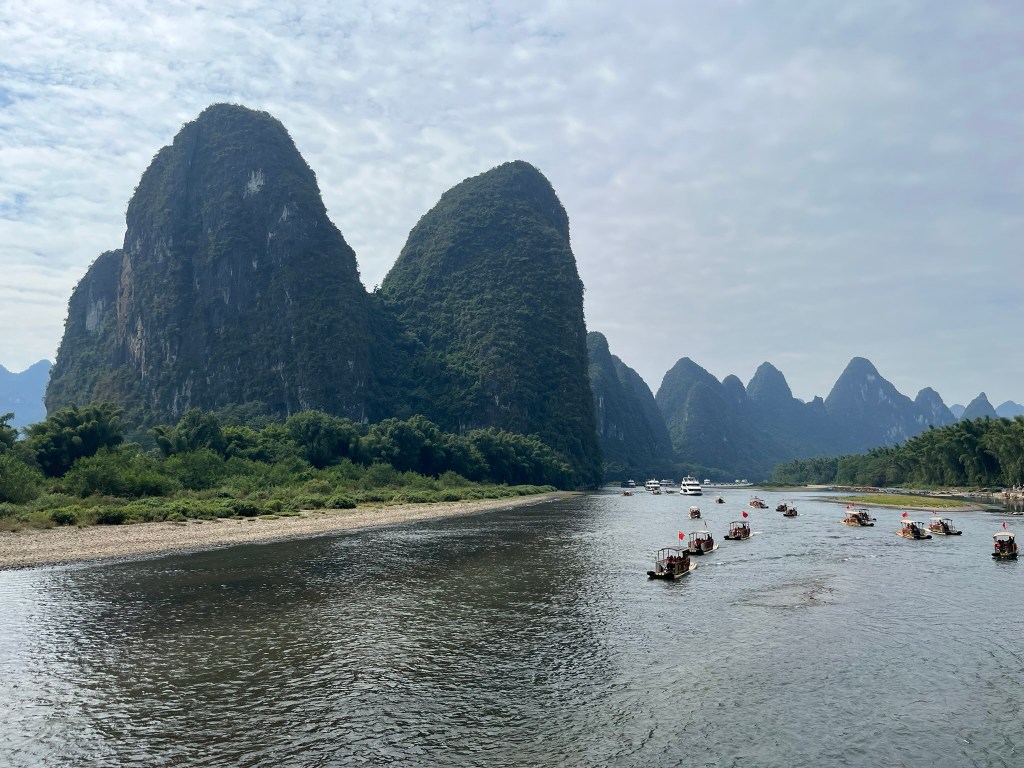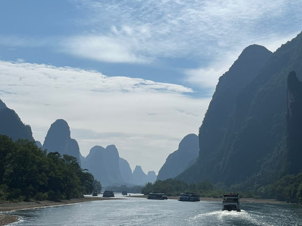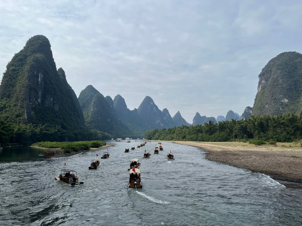 The starting point for most cruises is about 30 minutes drive outside Guilin City. Ten’s of cruise boats depart at 9am, 9.30am and 10am to make the 4-hour, 83km trip downstream trip to Yangshuo. After passing through security, you head out onto the wharf to find the pier and boat allocated on your ticket. You can take your luggage onboard if you are staying on in Yangshuo, but if you are on a multi-day tour like I am, it’s likely that your driver will make the 1hr journey to Yangshuo with your luggage. I was very relieved I didn’t have to carry my luggage on and off the boat! Everyone is allocated a seat at a 6-person table. Most of the boats seemed to have 2 floors of seating plus the the upper deck for enjoying the scenery outside. You will also be in a procession of boats with each a couple of hundred metres from the one in front and behind. My guide said during peak season there could be 100’s of boats headed down the river in an orderly queue, but today I think the 9.30 departure consisted of around 20 boats. The other boats aren’t super noticeable though and actually help create some great photo shots by giving scale to the enormous cliffs they are passing by. You’ll also be sharing the river with small motorized bamboo rafts taking groups of up to 4, up and down shorter sections of the river. Again, they add to the ambience.