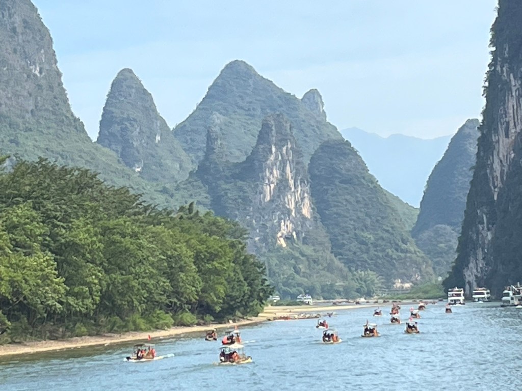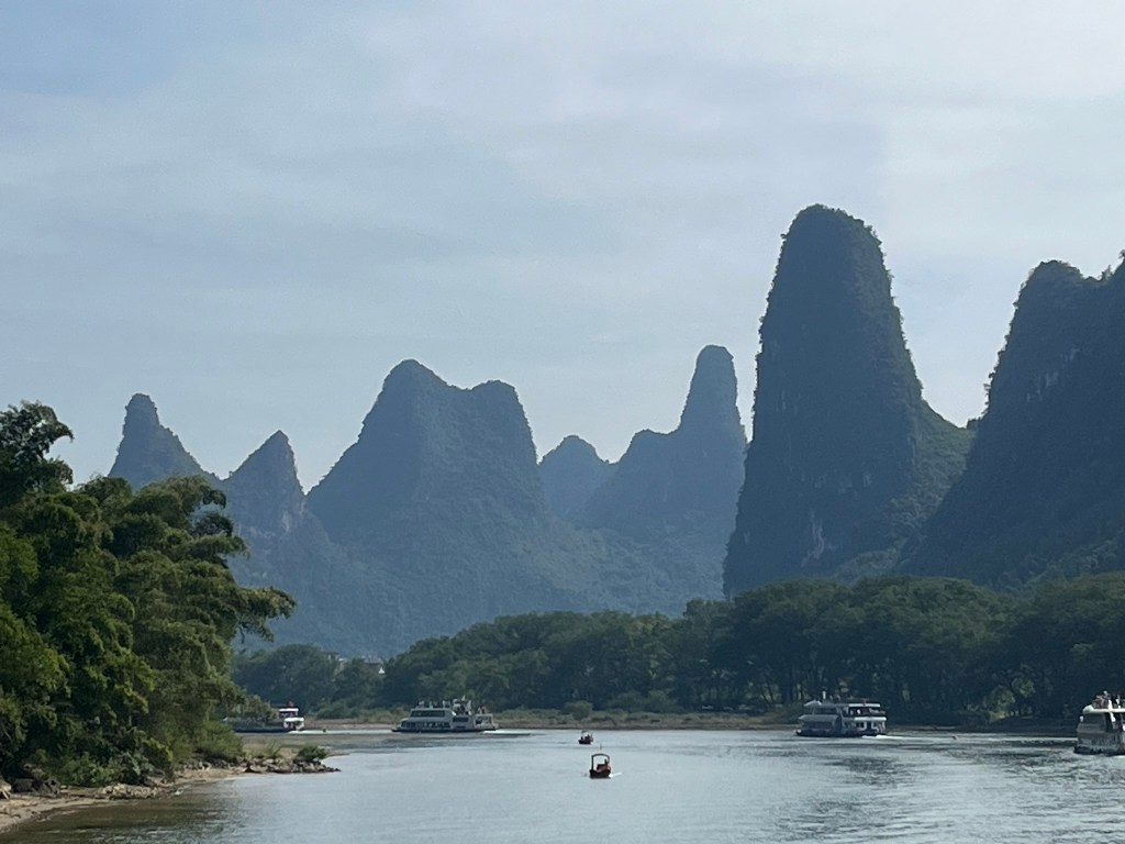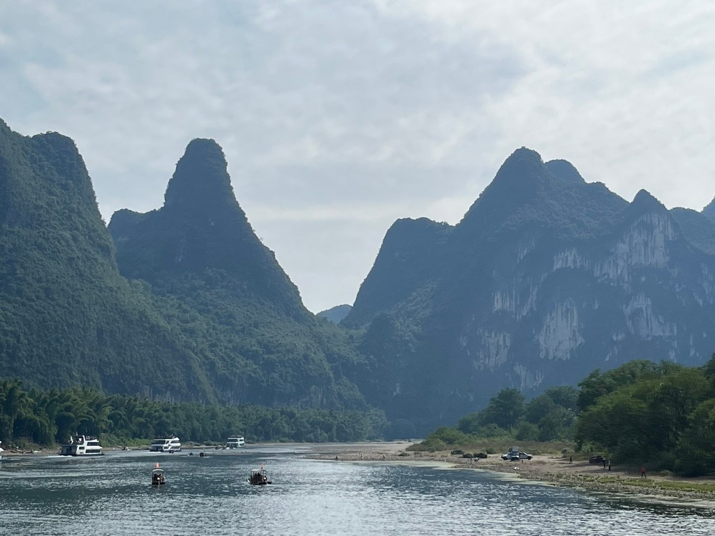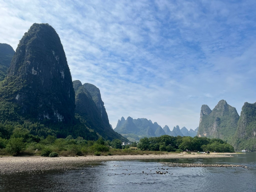 The first 20 minutes or so start quietly, with rolling hills, bamboo groves and small riverside villages. You’ll see water buffalo grazing on the banks, ducks paddling and locals crossing the river with their bamboo rafts. Once you pass Daxu Ancient Town, the dramatic karst peaks begin to appear and continue for the next 3 hours.