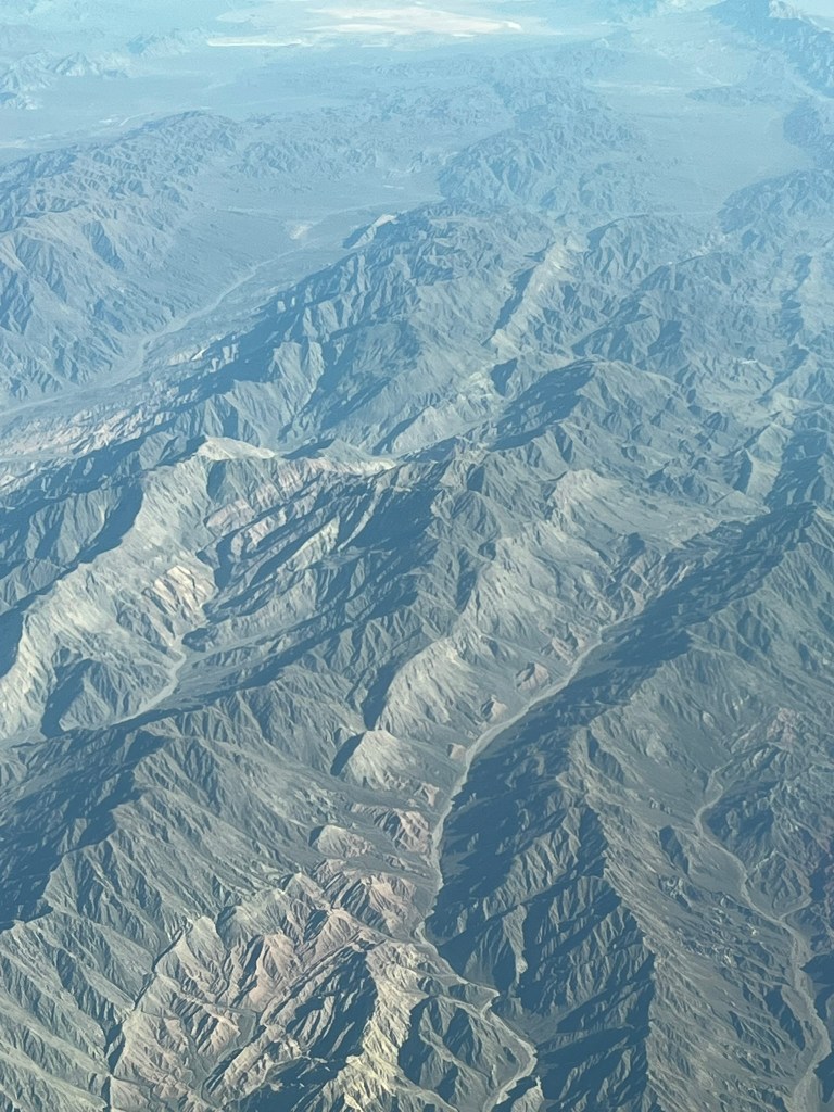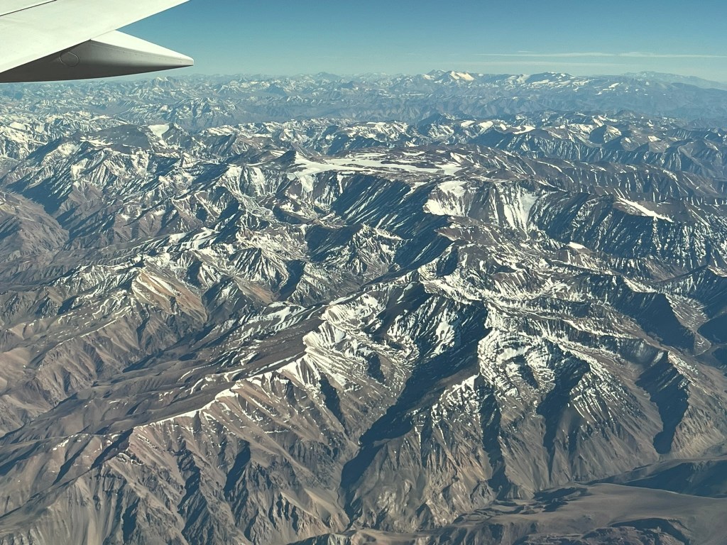 One you reach the main spine of the Andes, you see sharply ridged mountains with snowfields, glaciers and deep glacial troughts. This is the highest and youngest part of the Andes, formed by intense compression along the plate boundary. You can clearly see folded layers exposed along ridge lines and volcanic cones in the distance. Some slopes have striking color bands of reds, purples and ochres. This is due to the presence of iron, copper and sulfur and is a result of mineral oxidation. If you are on the left-side of the plane (which I was not) you get a great view of Aconcagua, a massive strato-volcano remnant, made up of uplifted marine sediments and volcanic rock, and standing at just under 7000m in height.