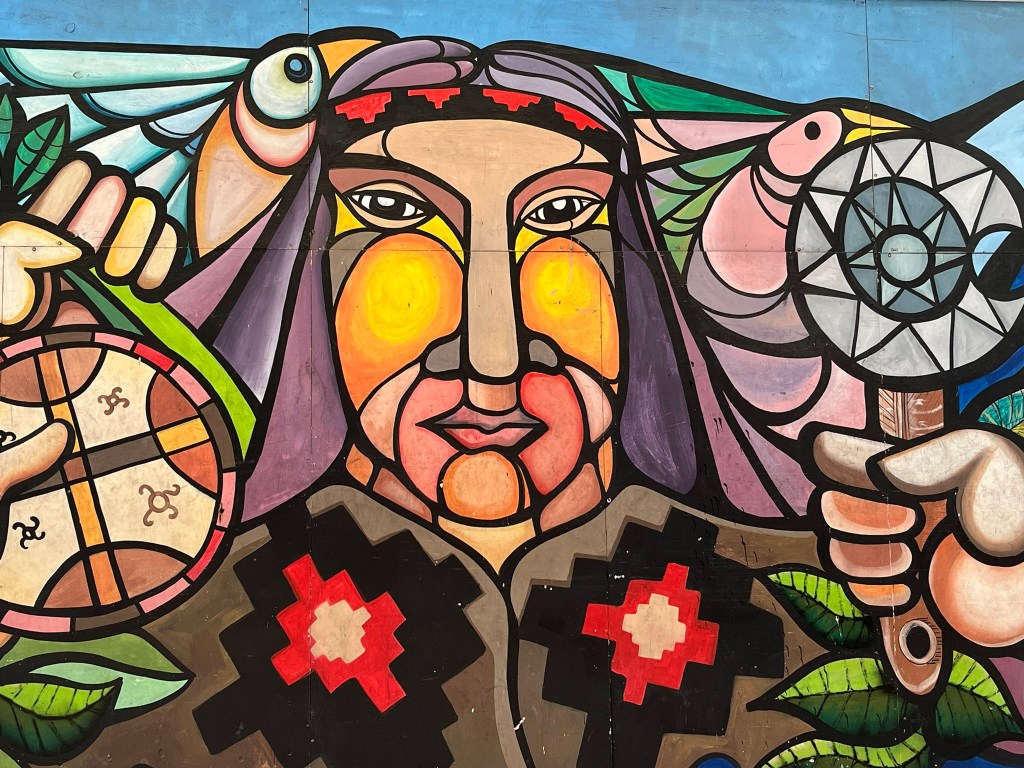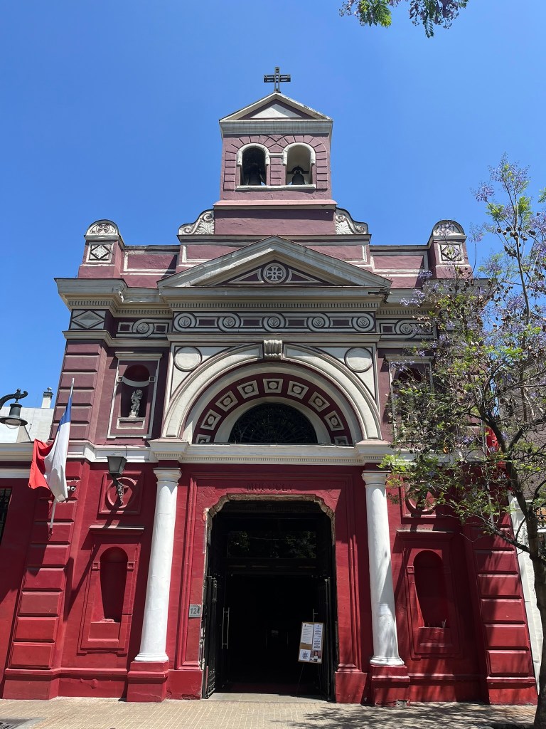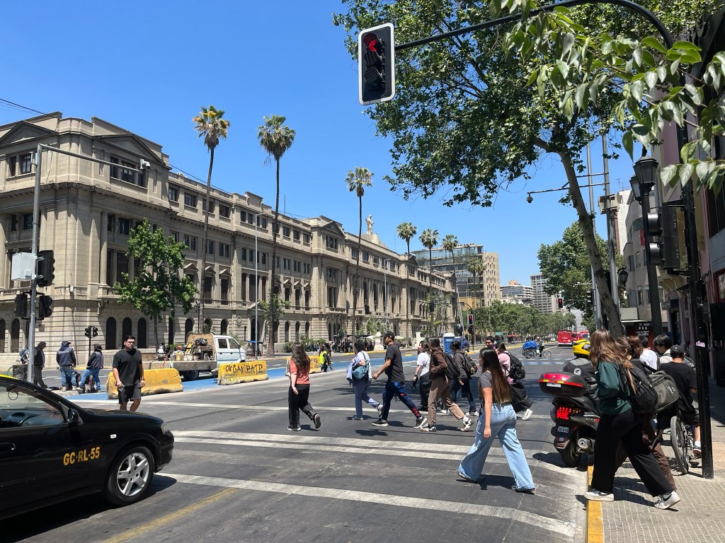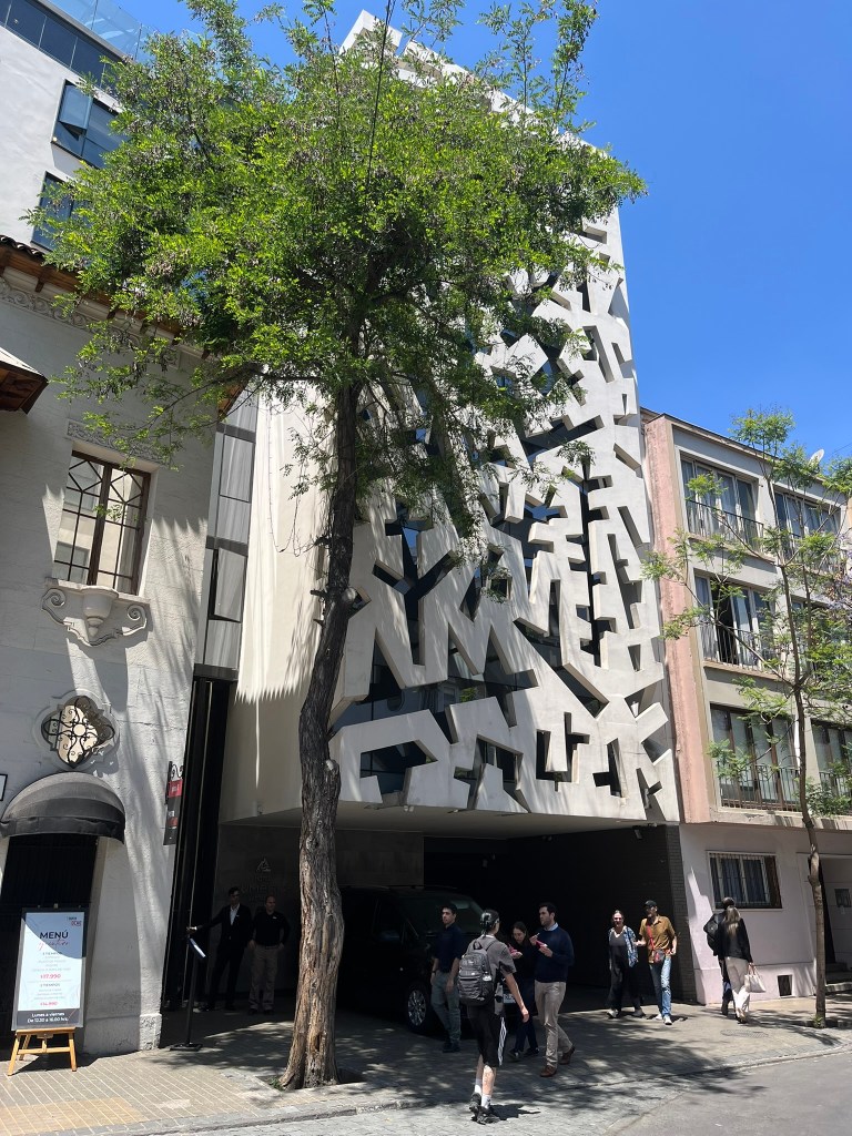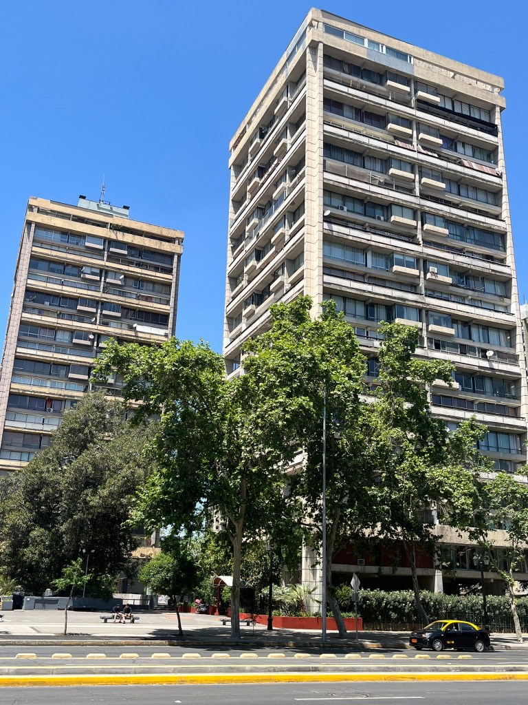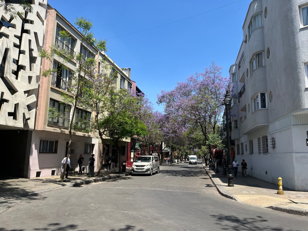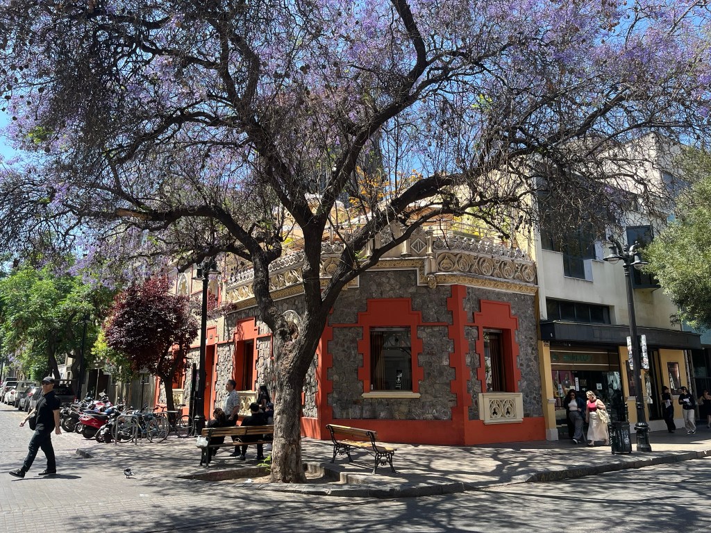 The streets of Lastarria are lined with shady and brilliantly purple Jacaranda trees and the buildings are a hodge podge of brightly painted older style buildings in contrast to newer apartment blocks. Overall it gives a relaxed and bohemiam vibe and you don’t feel like you are in the center of a big city at all. After a lunch pitstop of empanaditas (small stuffed pocked of pastry dough with fillings such as ham and cheese) we continued our wandering, passing by the modern Centro Cultural Gabriela Mistral on to one of the main avenues of the city. The city is full of energy with electric buses whizzing by filled with commuters and folks heading down into the city’s subway system.