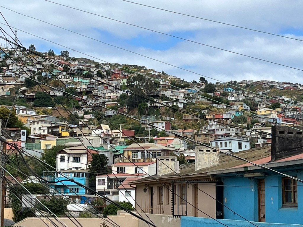Valparaiso’s historic quarter became a UNESCO World Heritage Site in 2003, as an outstanding example of late 19th century urban and architectural development in South America. It has a unique urban layout, with adaptation to extremely steep terrain, winding streets, funiculars and terraced housing. The houses have a wooden frame, but are covered in corrugated iron taken from old ships to protect against the salty sea air. The houses are brightly painted, and the reason is said to be that residents used up the paint left over from painting the boats. It is a chaotic city and considered a masterpiece of human adaptation to geography.