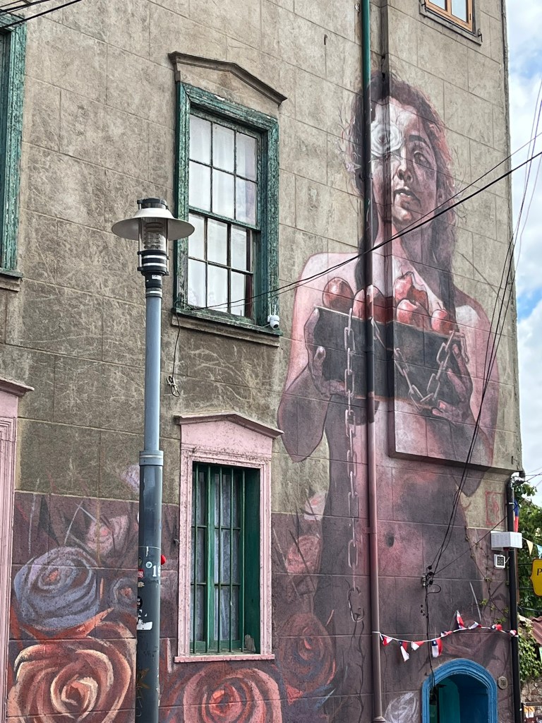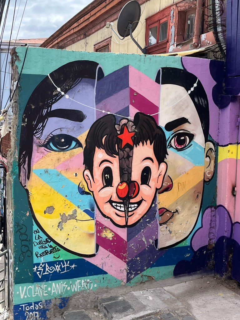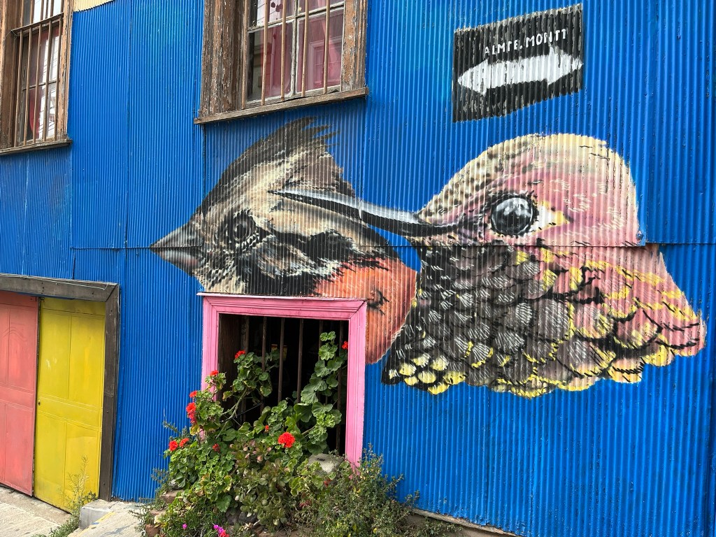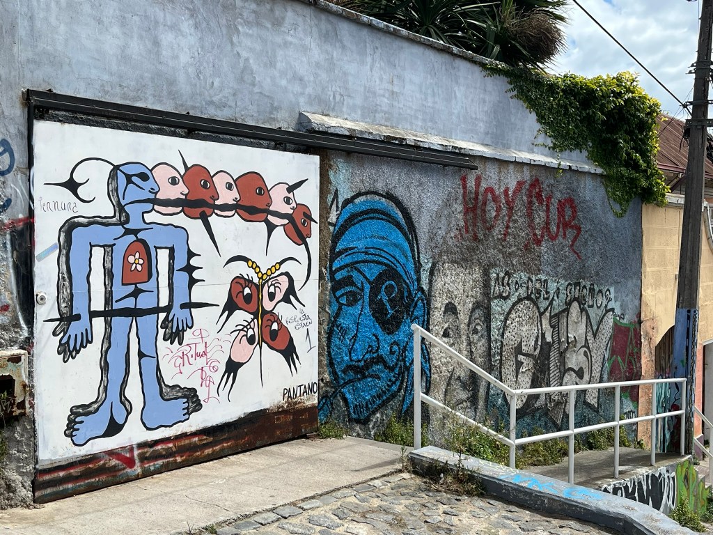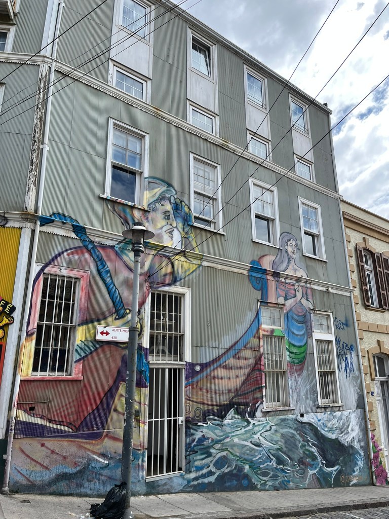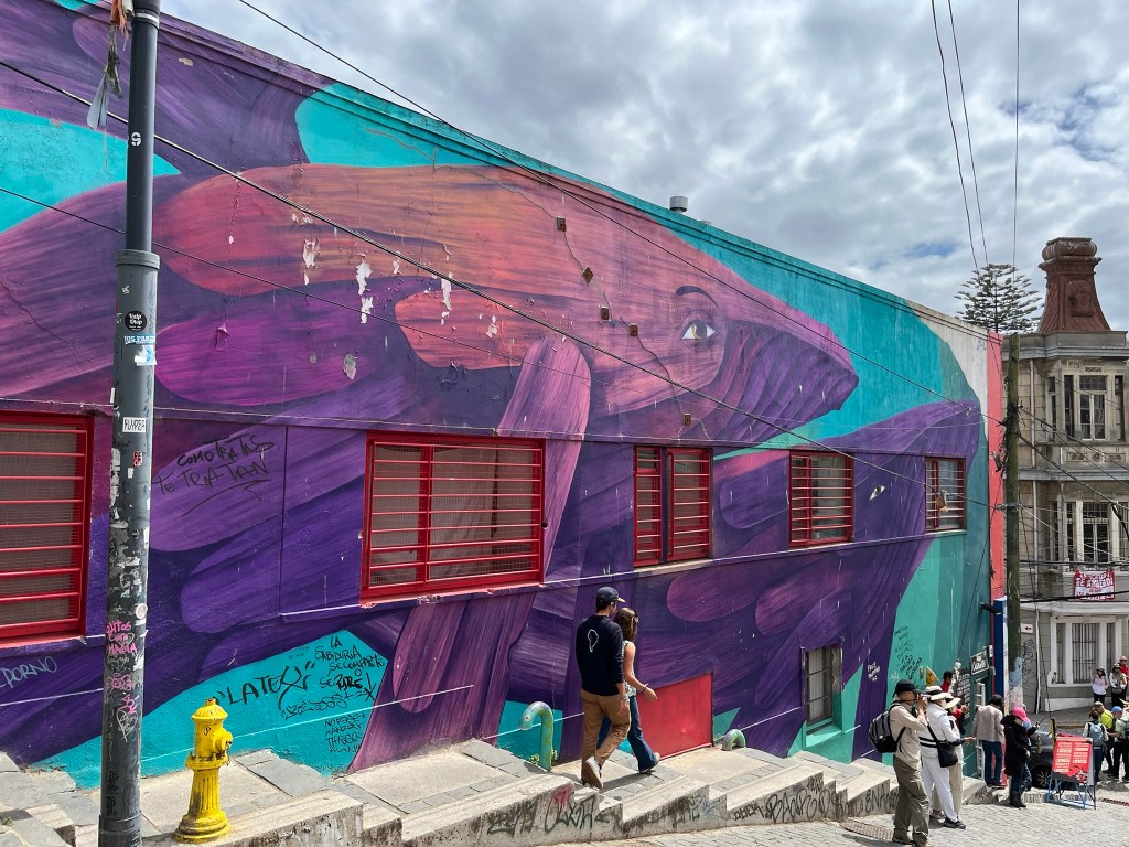 We started our walking tour of the historical quarter at the higher levels of Cerro Alegre or Concepcion (I’m not sure which) and zig-zagged our way through the streets. The area is an explosion of color with houses painted in bright reds, blues, yellows and greens and fantastic murals painted on almost every building and street corner. This is not low-quality graffiti, but art work that has been commissioned by the owners to cover their buildings from well-regarded local street artists. The range of artwork is broad and as you go from one street to another its easy to start recognising different artist’s distinctive styles. The area is a maze of windy streets and was definitely worth having a guide who could take us to the best spots with the most iconic art.