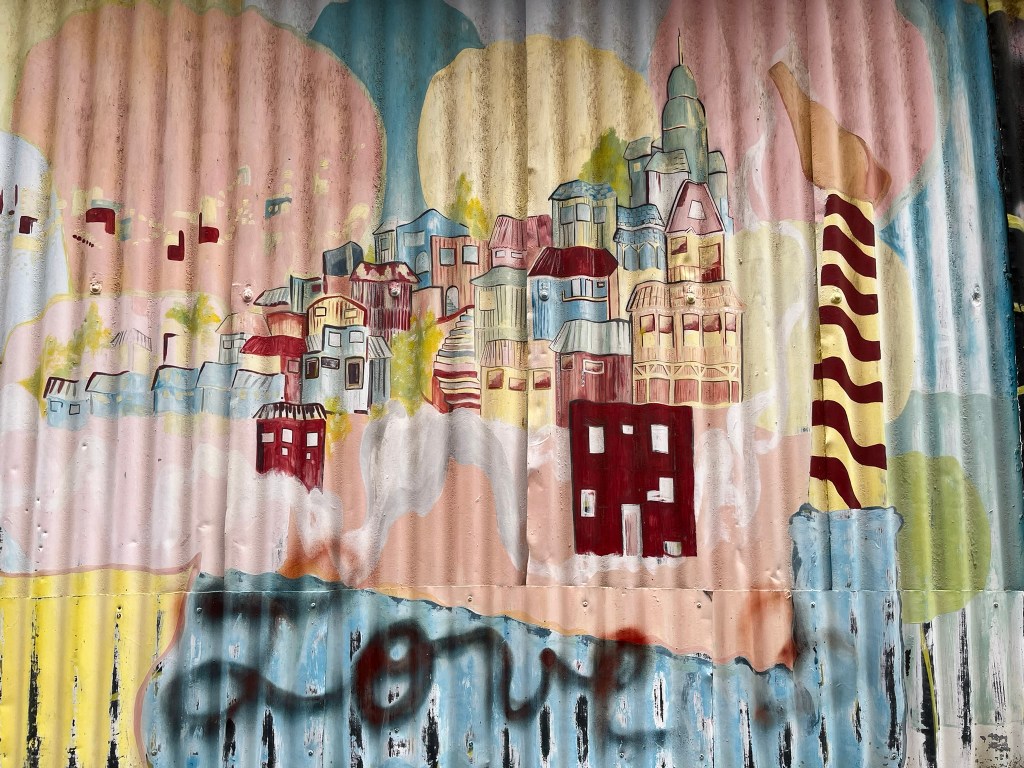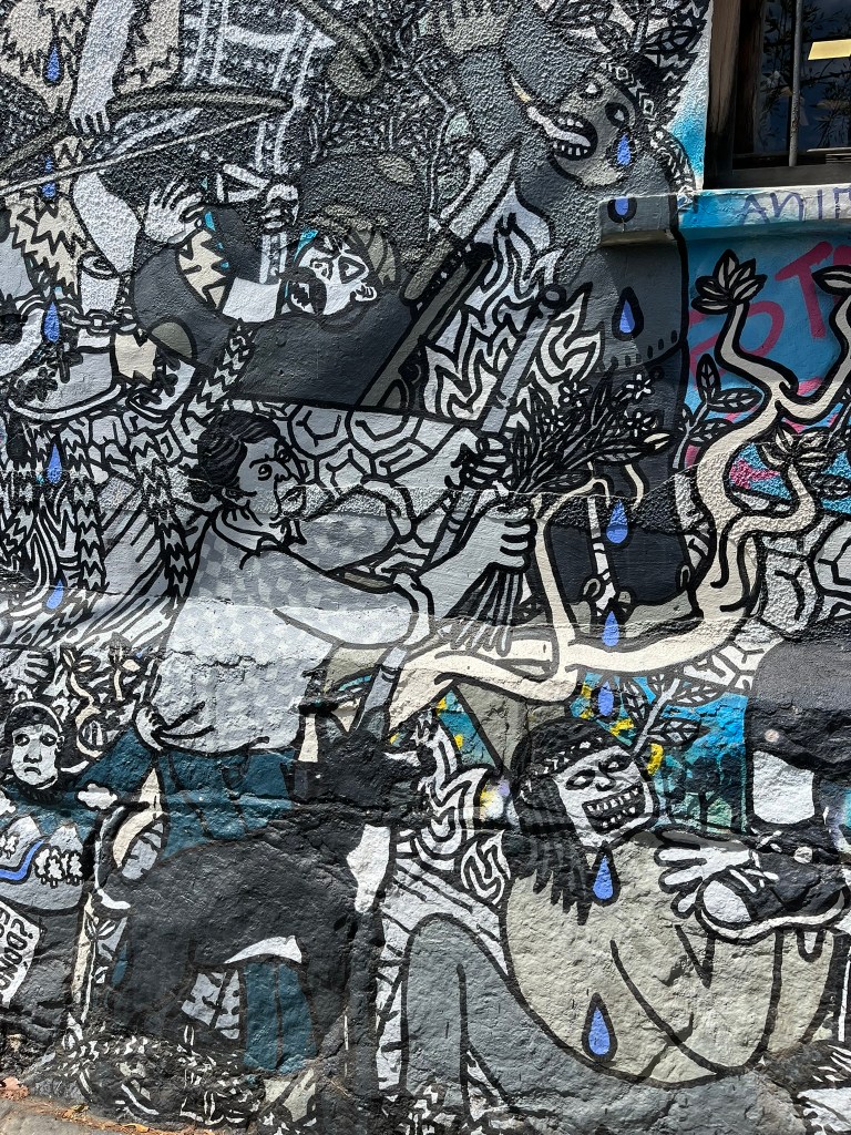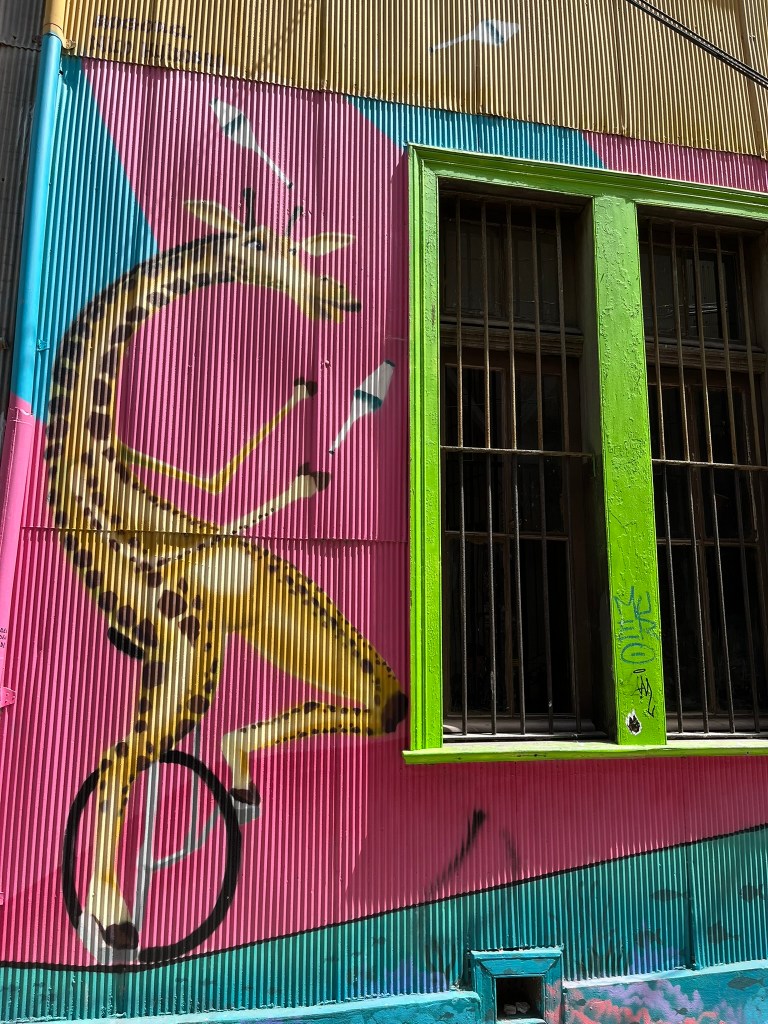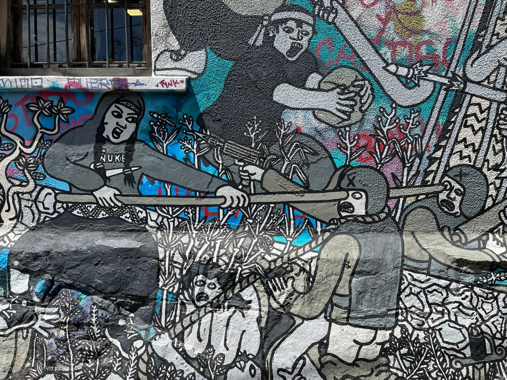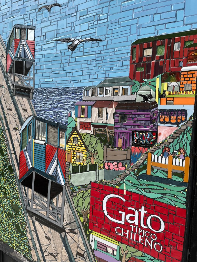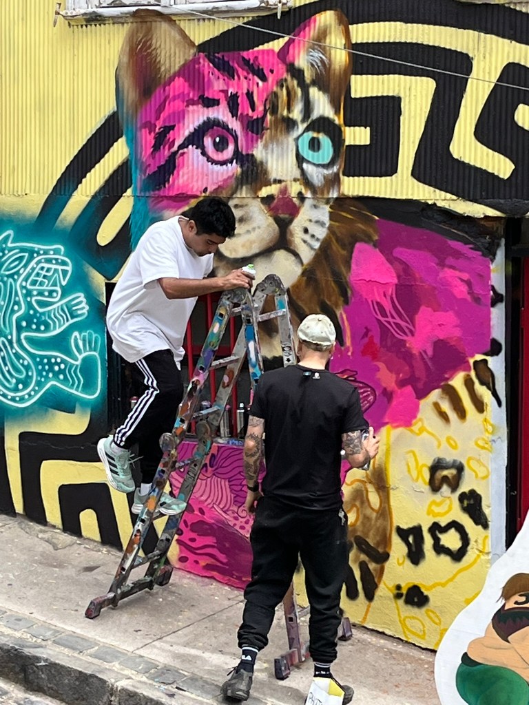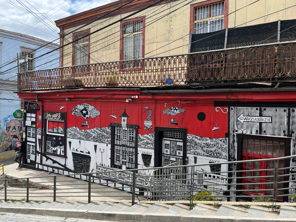 We started our walking tour of the historical quarter at the higher levels of Cerro Alegre or Concepcion (I’m not sure which) and zig-zagged our way through the streets. The area is an explosion of color with houses painted in bright reds, blues, yellows and greens and fantastic murals painted on almost every building and street corner. This is not low-quality graffiti, but art work that has been commissioned by the owners to cover their buildings from well-regarded local street artists. The range of artwork is broad and as you go from one street to another its easy to start recognising different artist’s distinctive styles. The area is a maze of windy streets and was definitely worth having a guide who could take us to the best spots with the most iconic art.