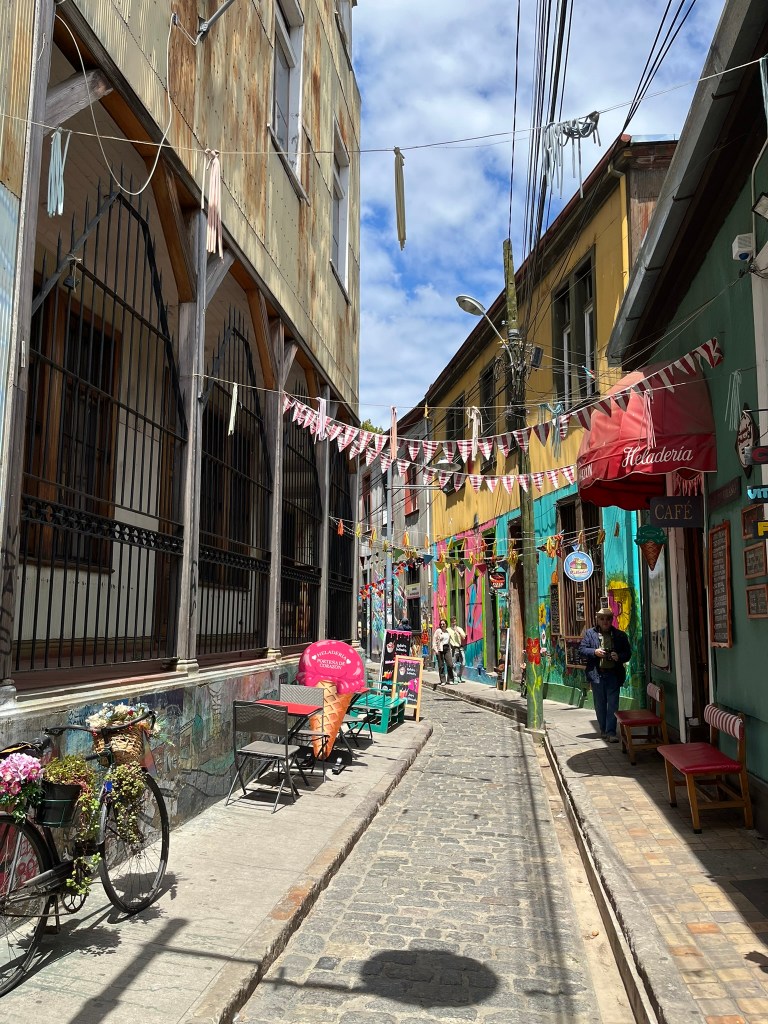 Valparaiso is a labyrinth of hills, murals, stairways and funiculars overlooking a wide Pacific bay. It’s an odd combination of a gritty working port and a UNESCO World Heritage Site rolled into one. The city is spread across 42 steep hills or ‘cerros’ that rise abruptly from the Pacific Ocean. The upper hills are a maze of narrow streets with colorful houses whilst the lower ‘plan’ area houses the flat port area, civic buildings and markets. To get between the upper and lower levels there are a series of antique funiculars that transport locals and tourists up and down for a few pennies a ride.