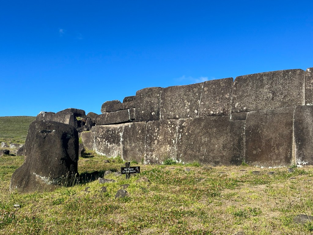 The first moai site we visited today was Vinapu. This site is famous because the stonework of the platform looks remarkably similar to Inca ruins in Peru, with precisely cut basalt blocks fitting together with tight joints and with no use of mortar. There is no other ceremonial platform on the island similar to this one, which makes it a bit of a mystery as to who built it? The moai have toppled from the platform.