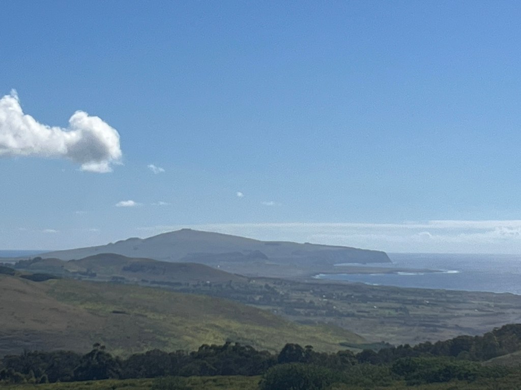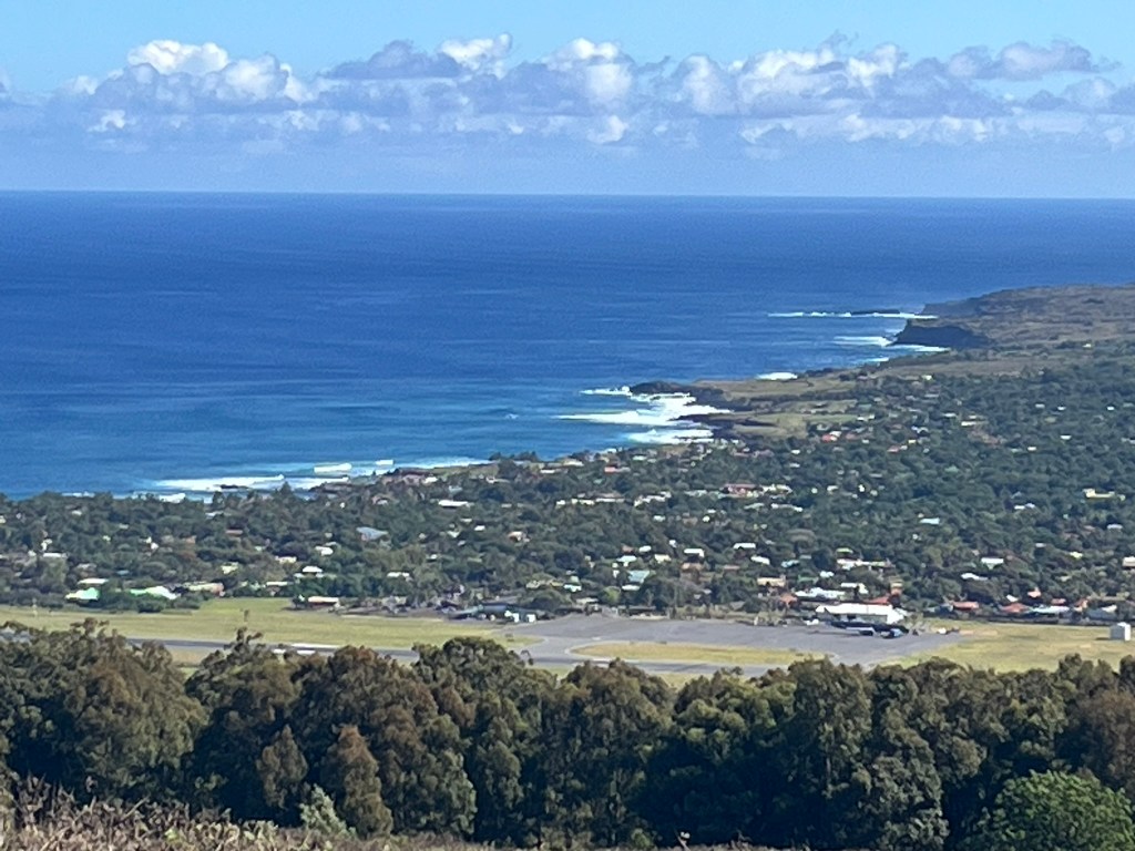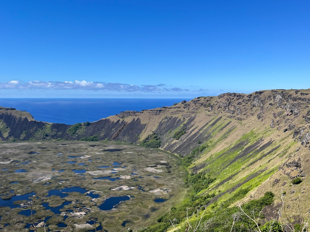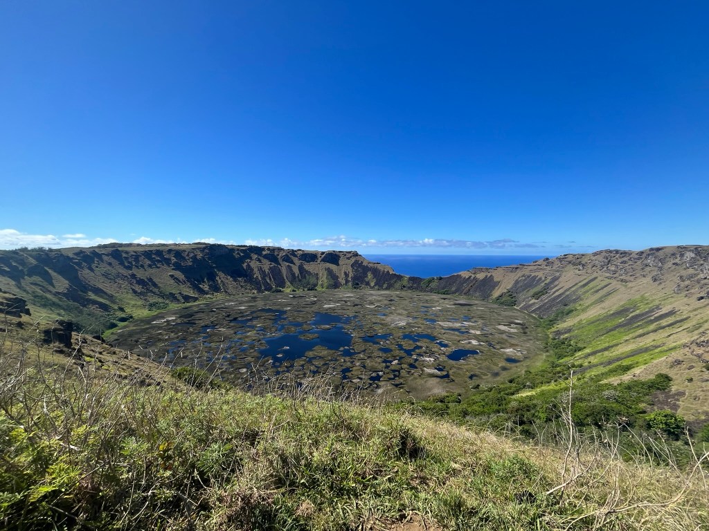 We then headed up to the Rano Kau crater, which sits on the far southwest corner of the island and overlooks the airport and Hanga Roa. The crater of this extinct volcano is 1.5km in diamter and its interior is flooded and filled with totura reed marshes. The walls of the crater are steep and covered in vegetation. It’s an epic view from the top.