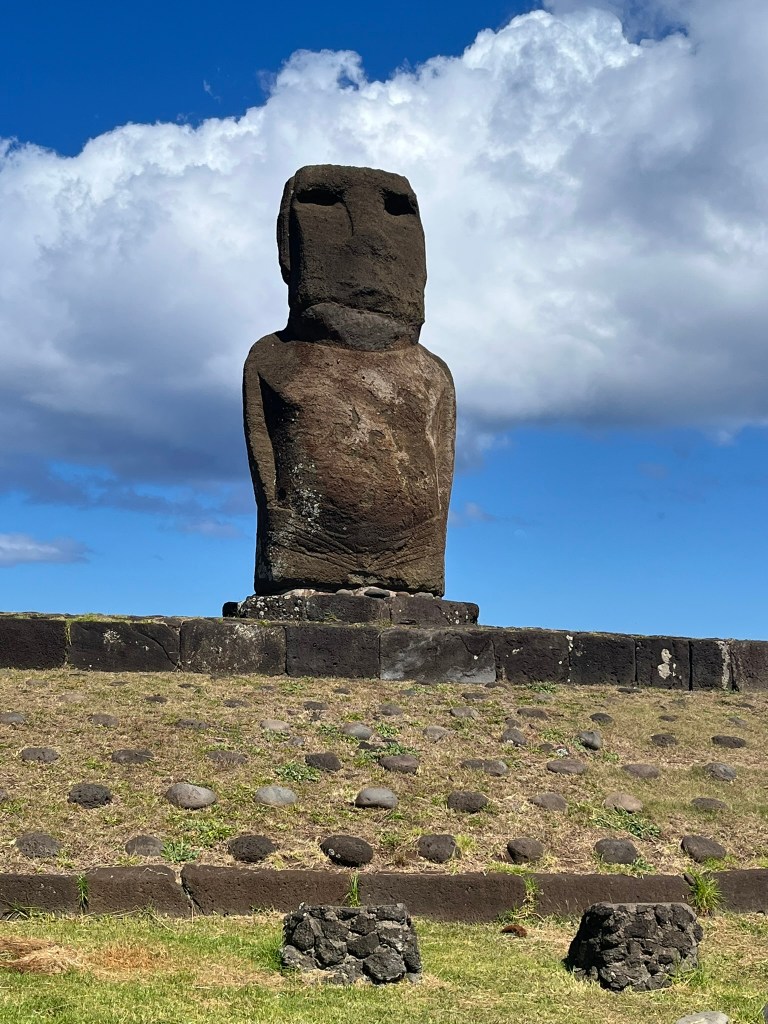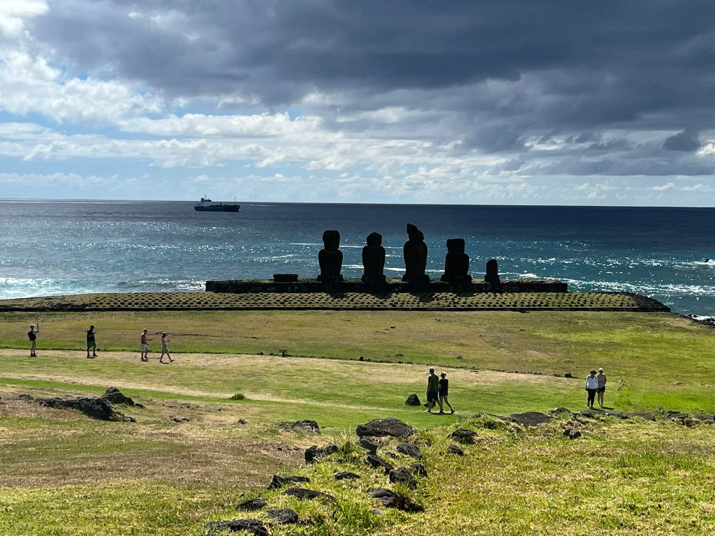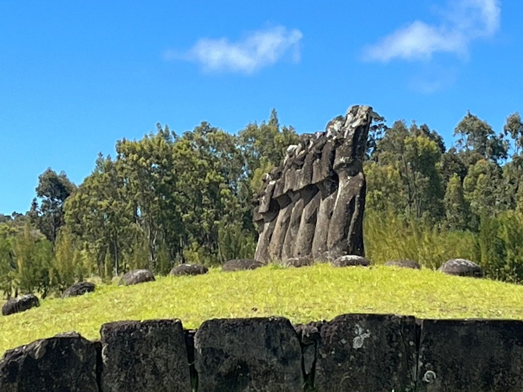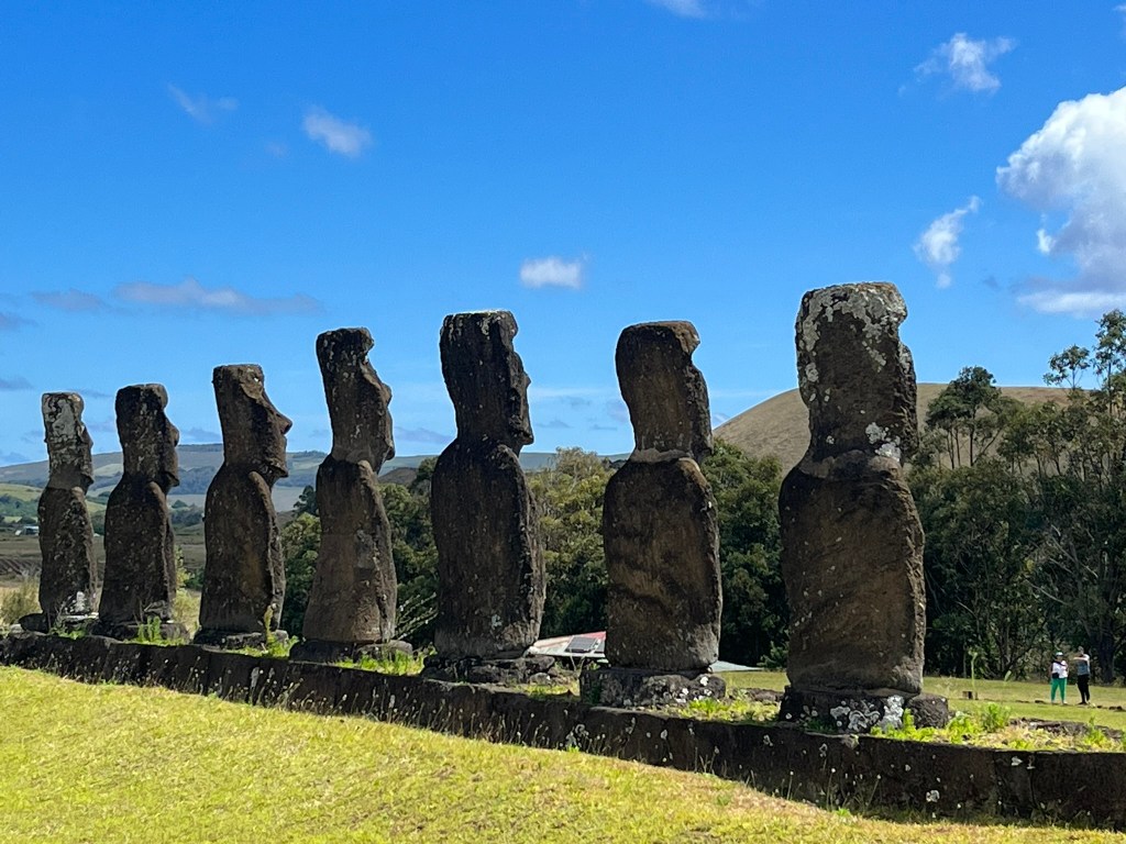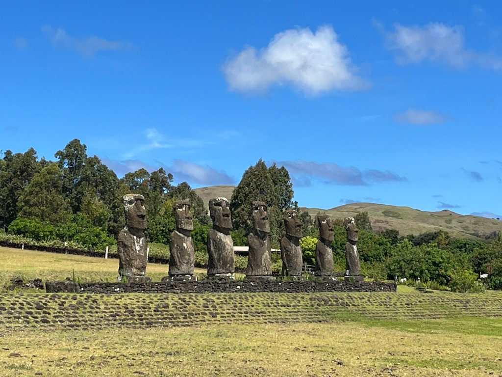 After this we headed to one of the highlights of the day – Ahu Akivi. These are the only major moai on the entire island that face the sea. Every other coastal moai faces inland to watch over their clans. But these seven moai face the ocean. According to oral Rapa Nui tradition, it is said that these seven moai represent the seven scouts sent out by Hotu Matu’a, the founding Polynesian chief to find the island before the main migration. They sailed ahead, found the island and returned to guide the settlement. And later they were honored by being represented by these statues.
