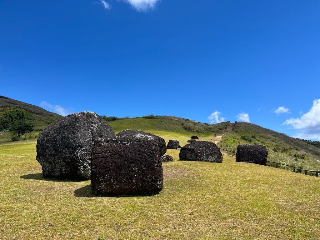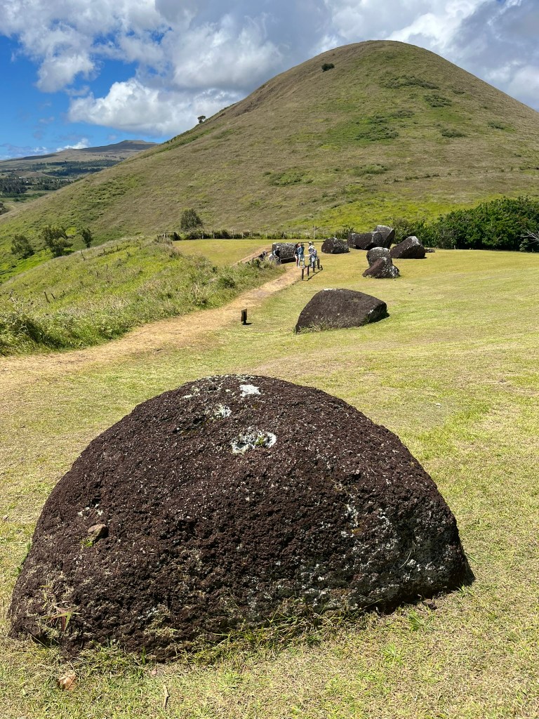 When you arrive at the quarry, there are dozens of unfinished topknots lying around the slopes. Some are complete, some half-formed. Just a few minutes climb from here you can look down into the quarry itself, although it is now overgrown with grass and difficult to make anything out. The big question is how were these topknots transported and placed on top of the moai’s heads. The best evidence suggests they were rolled sideways and then rolled up on ramps built up against the moai, and then lifted into place atop an already standing moai.