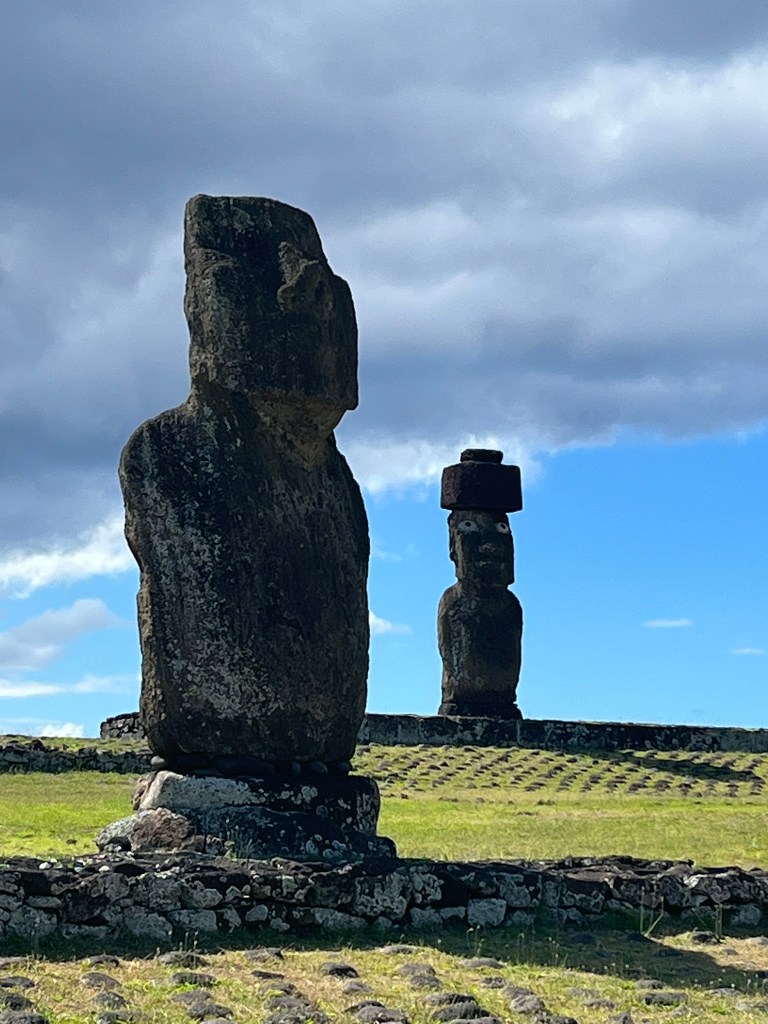 Our final stop and the last moai we would see during our time on the island was Tahai Ceremonial Complex. We were a bit sad to arrive here as it meant this was the end of our adventure on Rapanui and we have had a great time. Tahai is made up of three restored Ahu, each with distinctive moai. Ahu Vai Uri is a long platform with 5 moai of all different sizes. They are badly eroded but give a beautiful silhouette against the ocean.