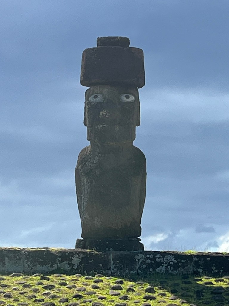 Next to this is Ahu Tahai, a lonely moai facing inland. And a little further up the coast is Ahu Ko Te Riku, or the ‘moai with white coral eyes’. This is the only moai on the island with restored eyes made of white coral and obsidian. With eyes the moai look completely different and a bit cartoonish. There is some mystery surrounding the eyes of the moai, as no evidence of white coral and obsidian has been found at any of the moai sights on the island except this one. This leads to the question – where are the eyes? And were they permanently inserted in the statues, or just put in place for special ceremonies when clans wanted to ‘activate’ their ancestors?