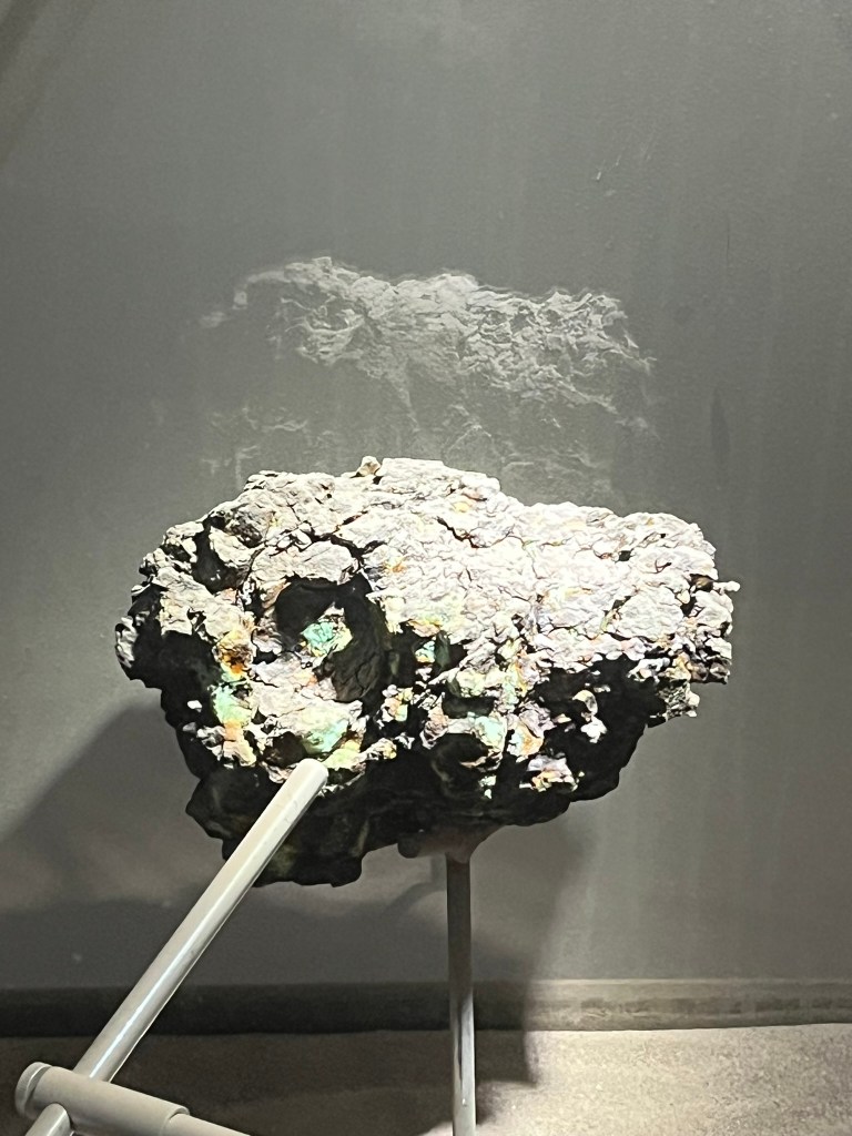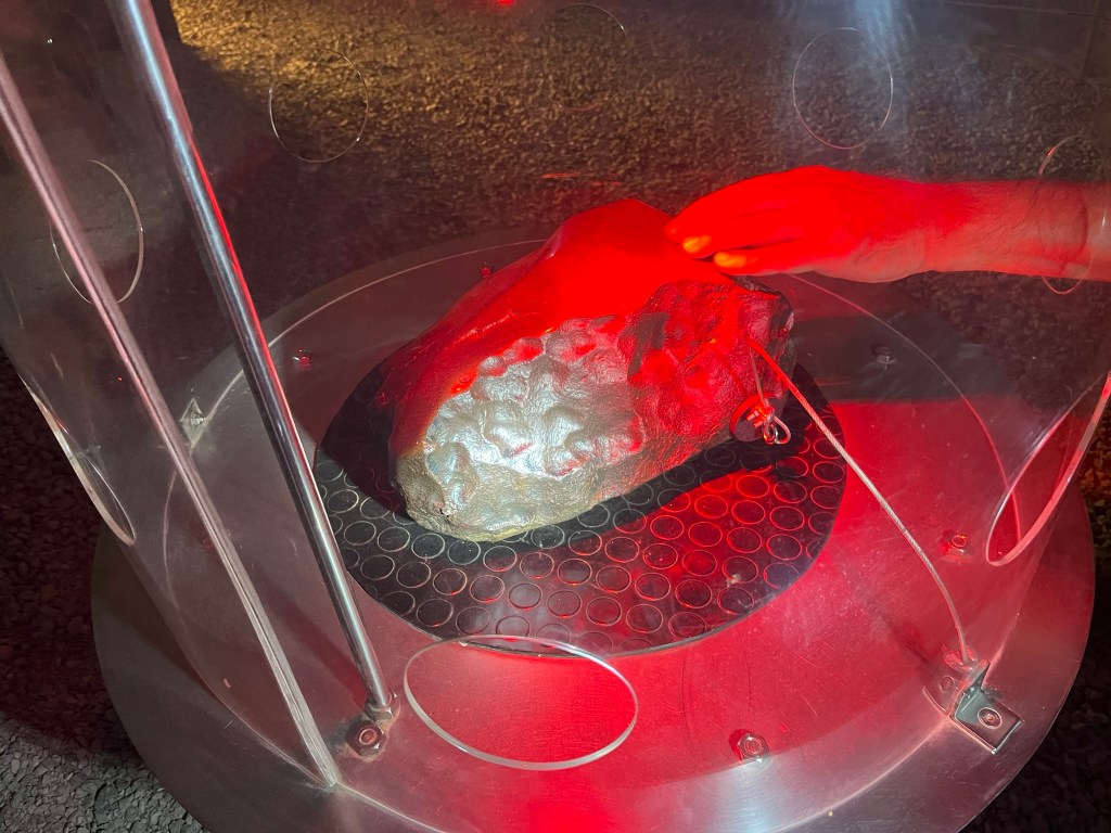 The highlight of the museum is the center three exhibits, where you are allowed to touch and feel a number of meteorites. During this part of the museum, a guide will join you, showing you how to recognize the difference between a volcanic rock and a metallic meteorite, by looking at whether there are oxygen particles present in the rock (there is not oxygen in space). And how to identify a chondrite, which is the most primitive type of meteorite, unchanged from the creation of our solar system versus an achondrite meteorite, which is one that has melted and differentiated to have a metal core.
