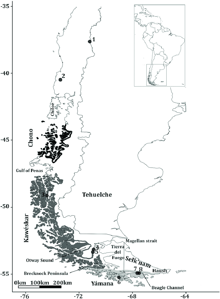 The Canoe People were groups called Yamana, Kawesqar and Selk’nam. They lived among the fjords, channels and islands of western Patagonia and moved around by canoe. The Selk’nam are especially known for their body-painting and minimal but effective clothing using grease and ash to protect against the cold.
