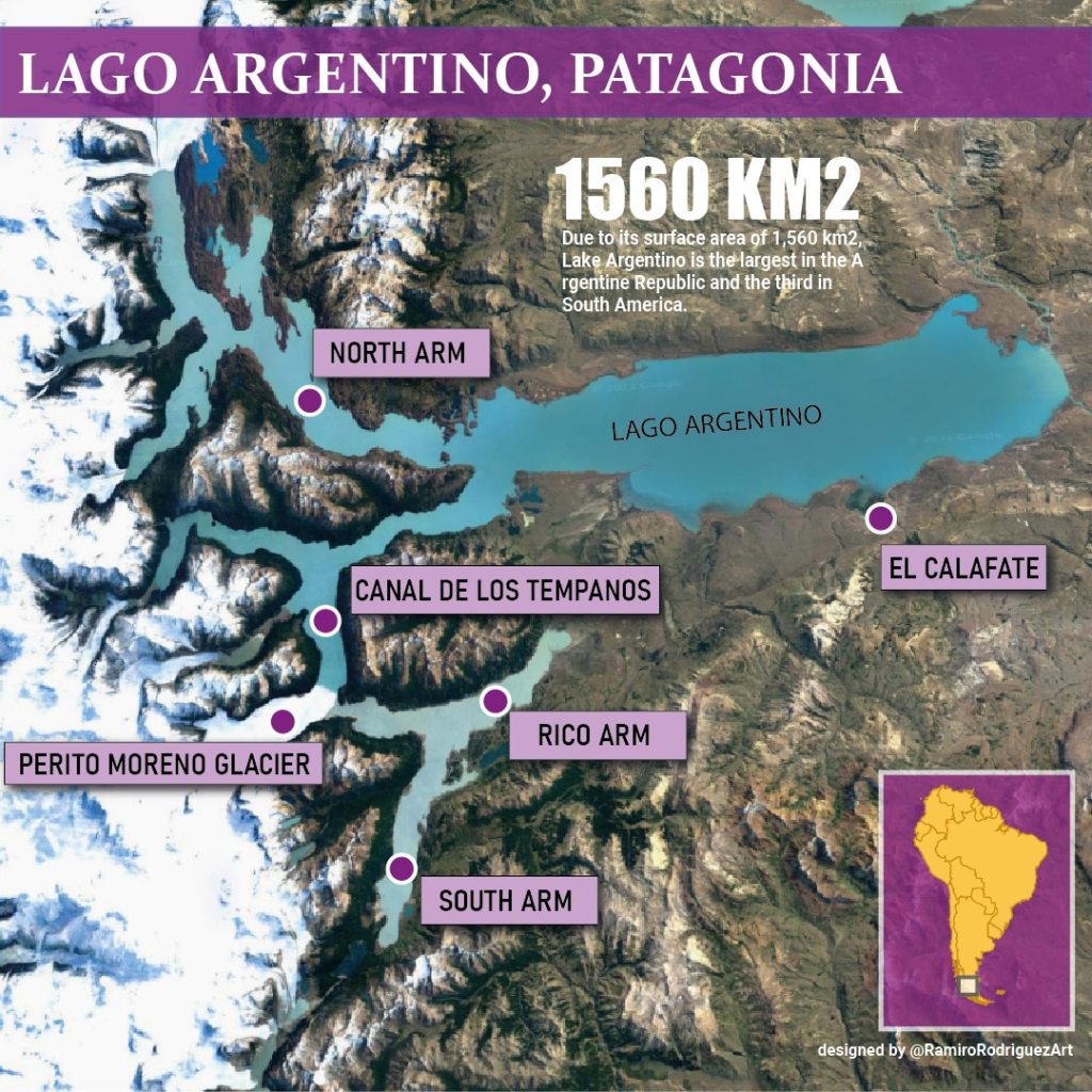 Lago Argentino lies in a huge glacial depression carved during the last Ice Age. Including its branches, the lake is 160km in length and 20-30km in width. It has a depth of up to 500m and a catchment basin on tens of thousands of square kilometers. The basin itself is about 40-50km in width. During the last glacial maximum a huge outlet glacier flowed east from the Andes and was up to 1km thick and filled the entire basin. As it advanced and retreated it bulldozed enormous amounts of material. When it pulled back it left behind a series of terraces, moraines and outwash plains, which you can easily see on the drive to El Calafate.