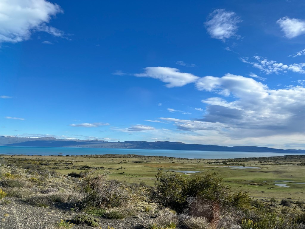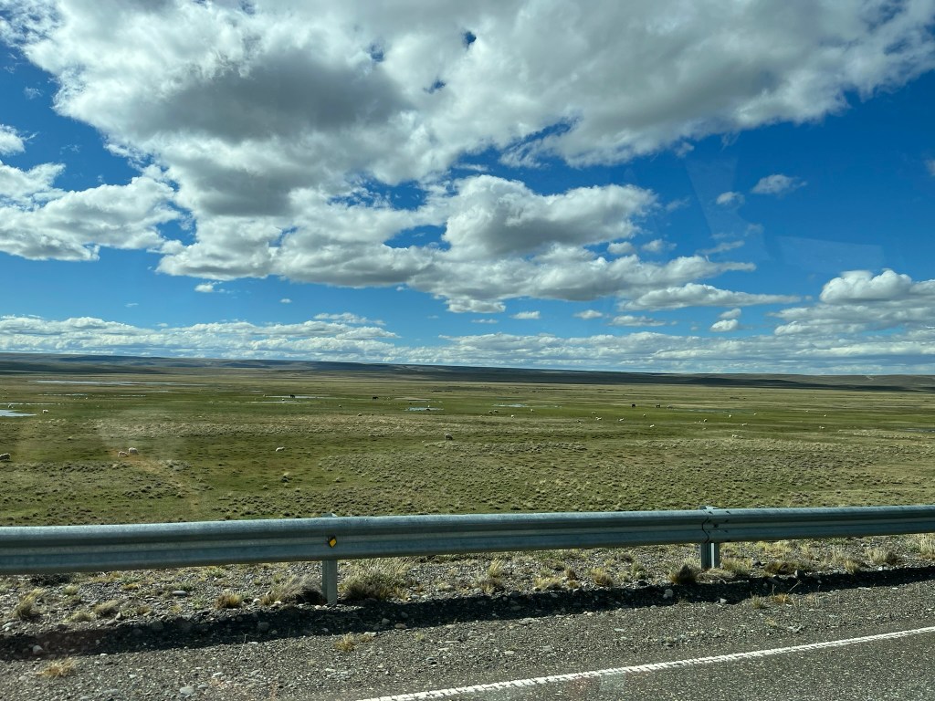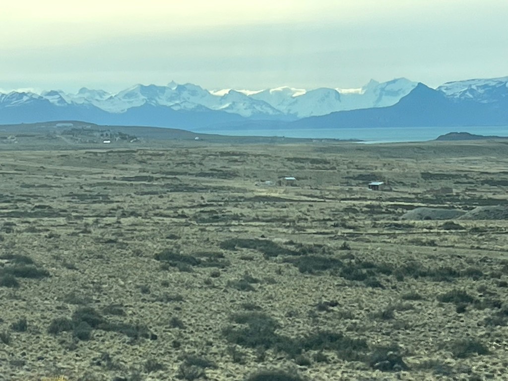 From here it is a long 3 hour drive to El Calafate through Argentinian pampas. This sounds romantic, but this is an incredible bleak, never-ending landscape of steppe as far as the eye can see. The road is straight and disappears into the horizon and there is very little variation in the scenery. I guess you need to experience this to truly understand how empty Patagonia truly is outside of the major towns and sights. You can however, get great views back to Torres del Paine, which are over 100km’s away but still visible in the distance. And its possible to see a fair bit of wildlife – herds of Guanaco, Darwin’s rhea (a kind of small ostrich looking animal) and birds.