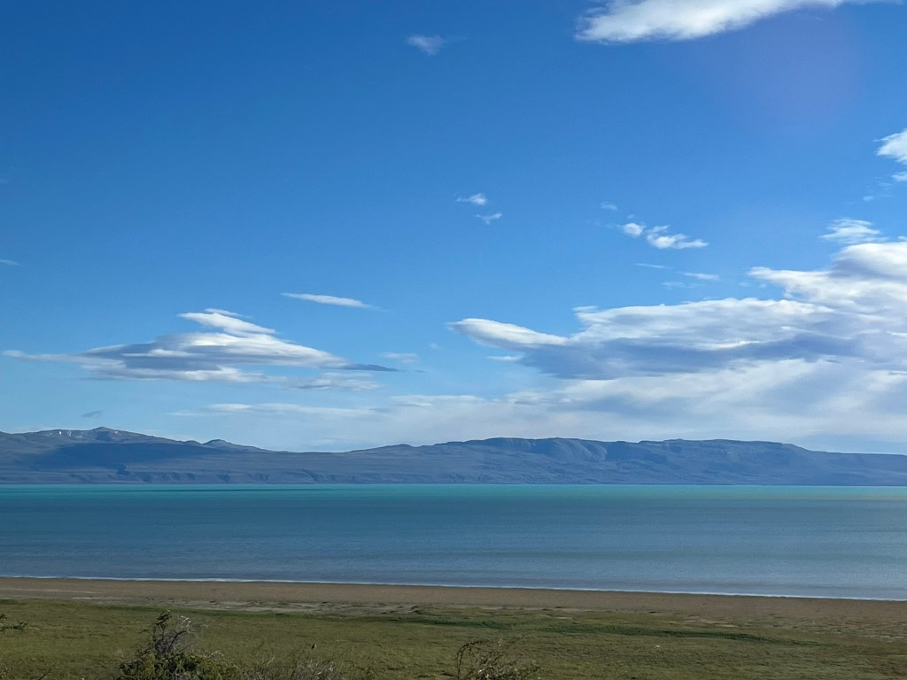 It’s a relief when you start descending into the huge valley that Lago Argentino sits in. After endless, wind-scoured steppe, the landscape quickly changes to U-shaped valleys, terraces and rounded moraines. You see the first flash of turquoise and the enormous Lago Argentino presents itself to you. This is the largest lake in Argentina and its brilliant blue color comes from the very fine sediment that is deposited and stays suspended in the water by the surrounding glaciers grinding bedrock.