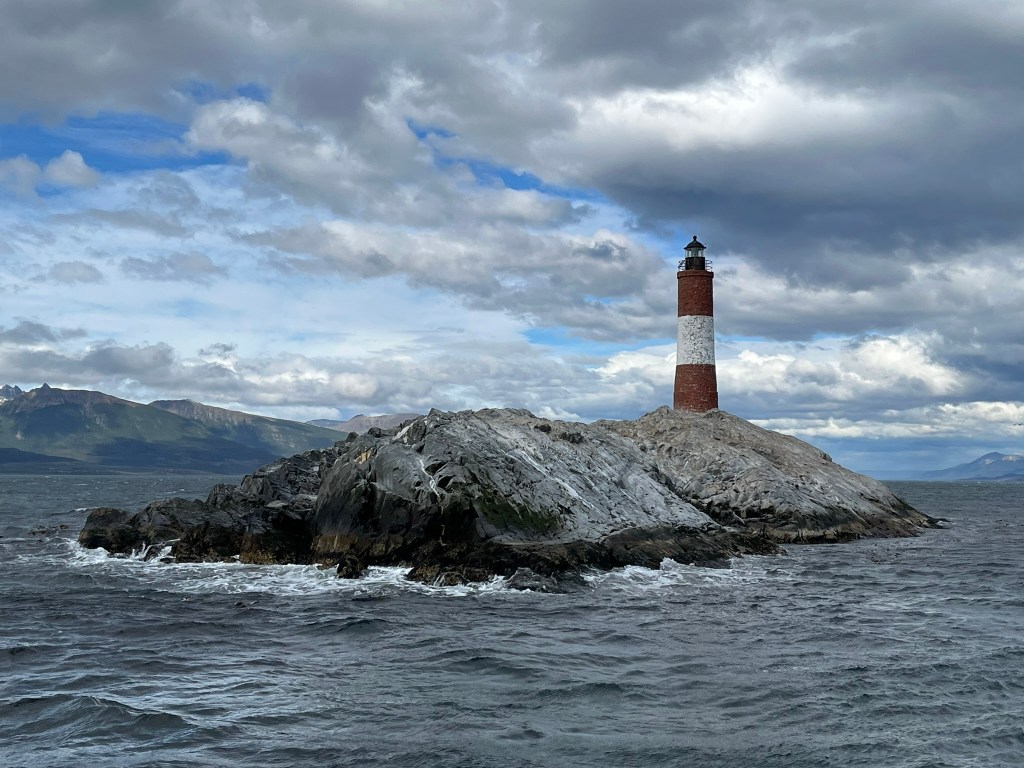 Next we headed to the lighthouse. The weather of the channel is not as windy as you expect it to be, as it is fairly protected from the worst of the wind by the surrounding mountains. Les Eclaireurs lighthouse, perched on a rocky outlet in the channel was built in 1920 by the Argentine Navy to improve safety for ships navigating the tight eastern Beagle Channel and is still operational today. It is a cylindrical brick tower, painted red and white. On the surrounding rocks there are also some large sea lion colonies which was great to enjoy.