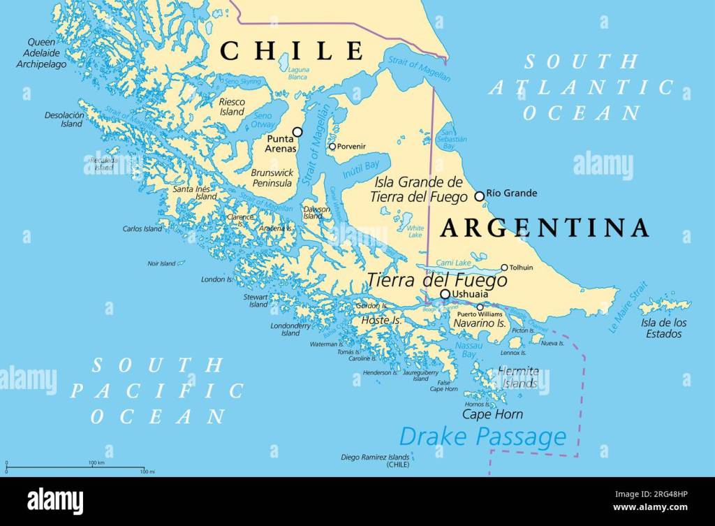 Tierra del Fuego, or the ‘Land of Fire’, is a windswept, glacially carved archipelago at the extreme southern tip of South America. It is split between Argentina and Chile. The Argentinian side is dominated by the last foothills of the Andes, which twist into jagged ridges, U-shaped glacial valleys, peat bogs and fjord-like channels. The Chilean side is mostly islands and dense evergreen subpolar forest and almost uninhabited. The name Tierra del Fuego comes from the explorer, Magellan, who saw the fires lit along the shores by the indigenous communities.